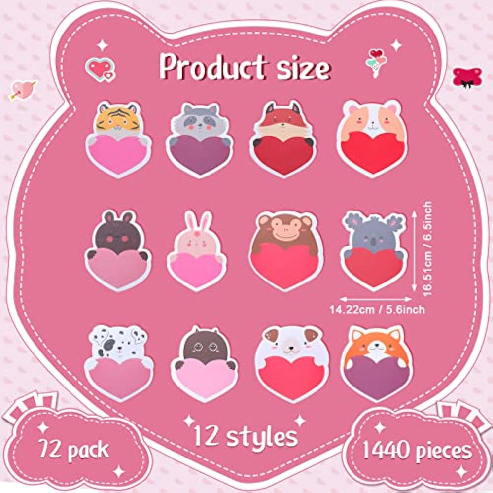 | Sufficient To Meet Your Needs: You Will Get 72 Pieces Of Valentine'S Day Sticky Notes, 12 Styles, Each Style Has 6 Pieces, Each Has 20 Sheets, With Size In Approx. 2.6 X 2.4 Inches; Sufficient Quantity Will Meet Your Using Needs, And You Can Share Them With Your Family | | Reliable Material: Our Cute Cartoon Animal Sticky Notes Are Mainly Made Of Reliable Paper Material, Safe And With Smooth Surface, Their Paper Is Suitable For Your Writing And Not Easy To Break Or Fade; Reliable Material Will Serve You For A Long Time | | Valentine'S Day Theme: Our Funny Animal Self Stick Memo Pad Is Designed In Valentine'S Day Theme, Printed With Many Cute Animals, In Line With Most People'S Aesthetic, Look Delicate And Beautiful, Which Will Add To The Festive Atmosphere And Bring You A Good Mood | | Useful And Practical: You Can Record Important Things On Our Animal Sticky Notes Bulk, Then Put Them On The Refrigerator, When You See Them, You Will Know What Needs To Be Done Next, Will Be Useful And Practical To You | | Easy To Use: Our Animal Sticky Notes Are Small And Light, Won'T Take Up Too Much Space, You Can Carry Them To Other Places Easily, And They Are Easy To Tear Off, Will Bring You Convenience In Using; You Can Use Them On Various Occasions, Like Home, Office | |