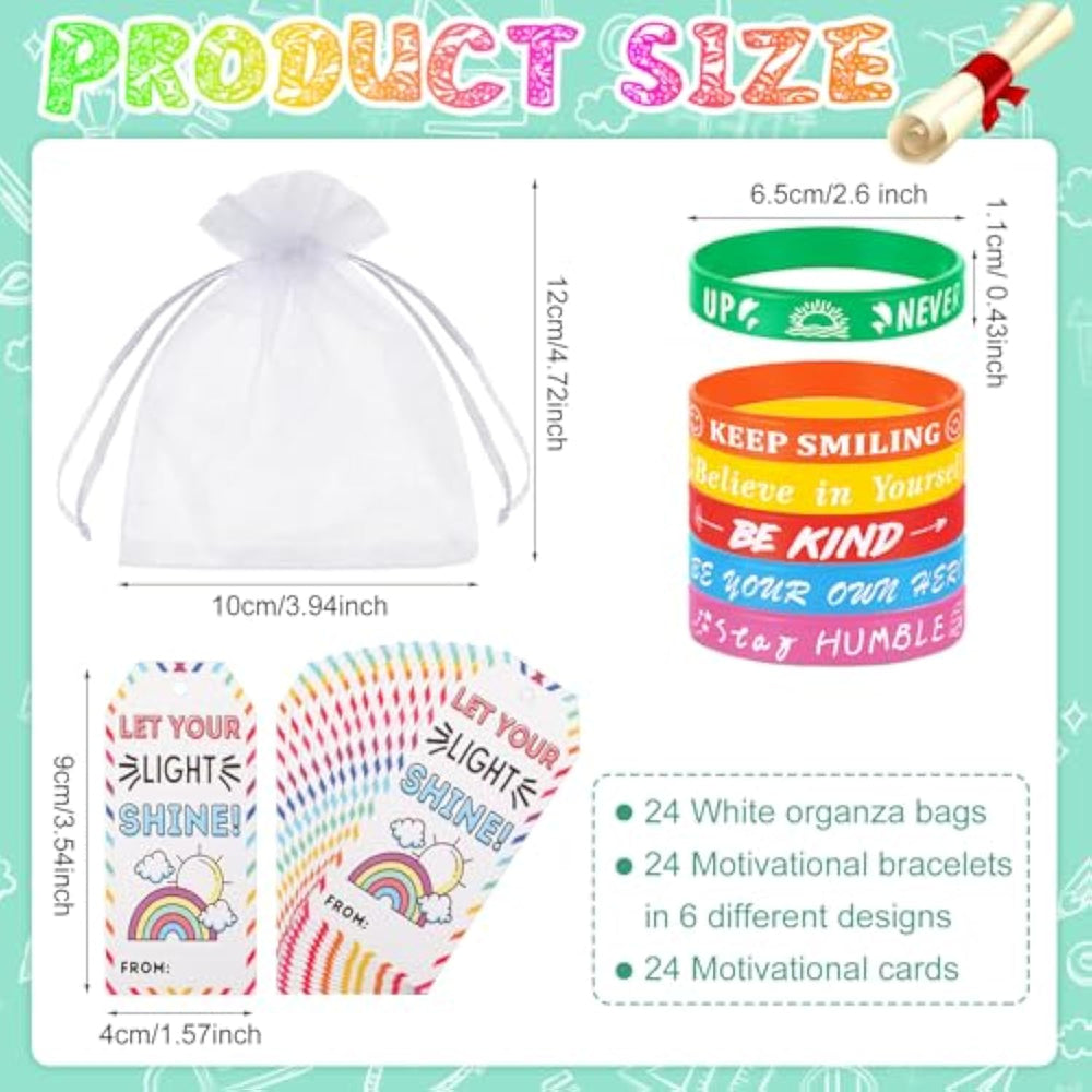 | Assorted Inspirational Wristbands Set: You Will Receive 24 Pieces Of Silicone Bracelets For Kids In 6 Styles, 24 Pieces Of Gift Tags And 24 Pieces Of Organza Bags; Sufficient Quantity And Different Patterns Will Meet Your Different Using And Replacement Demands, You Can Also Share Them With Your Family And Friends | | Size Information: Inspirational Silicone Wristbands Are Approx. 2.56 Inches In Diameter; And The Size Of The Gift Cards Is About 1.57 X 3.54 Inches/ 4 X 9 Cm And Mesh Organza Bags Are Approx. 3.94 X 4.72 Inches/ 10 X 12 Cm | | Reliable Material: The Motivational Quote Wristbands For Kids Are Made Of Quality Silicone And Rubber Materials, Which Are Soft And Comfortable To Touch, Flexible To Wear, Elastic And Not Easy To Deform, Not Easy To Fade Or Fray And Will Not Irritate The Skin And Can Be Applied Repeatedly | | Widely Use: To Inspire Your Family, Friends, And Classmates To Maintain Their Optimism, You Can Use These Inspirational Silicone Bracelets As Party Favors, Classroom Rewards, School Prizes, Birthday Gifts, And Christmas Gifts; They Are Also Appropriate For Everyday Use And Wear On A Variety Of Occasions | | Motivational Quote Themed Design: There Are Some Inspirational Quotes On These Motivational Bracelets In Different Colors, Such As [Be Kind], [Never Give Up] And So On, Which Will Provide You With Positive Encouragement And Support, Helping You Enhance A Positive Attitude And Build Your Confidence | |