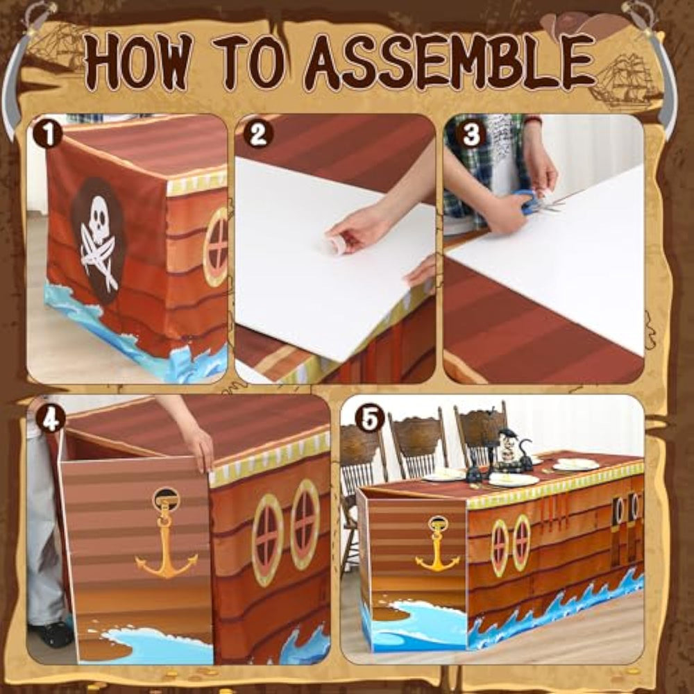 | Package Includes: You Will Receive 1 Pcs Pirate Tablecloth, 3 Pcs Prow Cardboard; There'S No Risk Of Running Out Of Supplies At Your Pirate Party, Making It Easy To Enjoy The Party; You Can Decorate The Party As You Want To Make The Party Theme More Vivid | | Reliable Material: Our Pirate Tablecloth Is Made Of Plastic, Which Can Be Wiped With Water And Reused; Moreover, The Prow - Shaped Part Is Crafted From Cardboard, Ensuring Reliability And Reusability, With High Resistance To Damage And Fading | | Suitable Size: Our Pirate Party Table Cover Measures About 72 X 30 Inches, Each Of Prow Cardboard Measures About 31.5 X 10.47 Inches; 3 Pcs Prow Cardboards Can Be Assembled Into A Prow - Shaped Structure, Making Our Table Look More Like A Pirate Ship | | Easy Assembly: Just Place The Nautical Themed Table Cover On The Table, And Assemble The Three Boards Following The Steps In The Video To Get A Vivid Prow - Shaped Decoration; Perfect For Indoor Or Outdoor Parties; They Are A Great Table Decoration That Can Make Your Adventure Themed Party More Colorful | | Widely Used: Pirate Party Tablecloths Are Perfect For Pirate Birthdays, Jungle Adventure Decorations, Birthday Parties, Graduation Parties, World Pirate Themed Parties, Beware Of The Pirate Decorations, Sailing Themed Events, And Other Themed Gatherings | |
