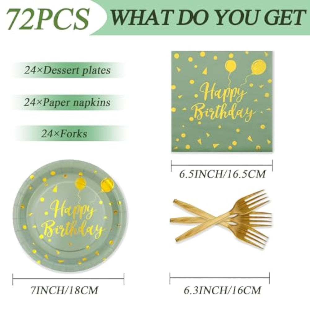 ??Exquisite Birthday Party Tableware Set?Our Sage Green And Gold Party Tableware Set Includes 24 X 7 Inch Paper Dinner Plates, 24 X 6.5 Inch Napkins, 24 Sets Of Gold Forks. Great Value For Money, Perfect To Use For Birthday Parties! | ??Stylish And Understated Design?The Paper Cake Plates Are Sage Green In Color And Designed With Golden Happy Birthday, Gold Foil Dots And Triangles And Golden Balloons. These Classic Design Elements Can Make Your Party More Elegant And Stylish While Dining, Very Aestheti