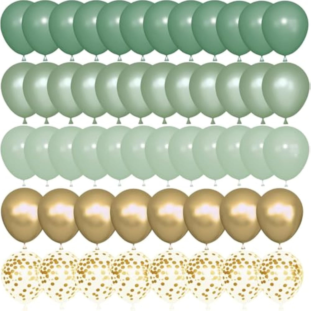 This balloon set includes 15 pieces each of 12-inch pearl green, sage green, light green, and metallic gold balloons, along with 10 pieces of 12-inch gold confetti balloons and 2 ribbons. Ideal for a variety of occasions, it is perfect for sage green-themed parties, bridal showers, weddings, engagements, safari baby showers, bachelorette parties, anniversaries, corporate events, graduations, and photo shoots. The balloons are easy to assemble—simply inflate them with air or helium, use the ribbons to tie them, and create your own DIY balloon garland or arch. To make them float, be sure to fill them with pure helium.