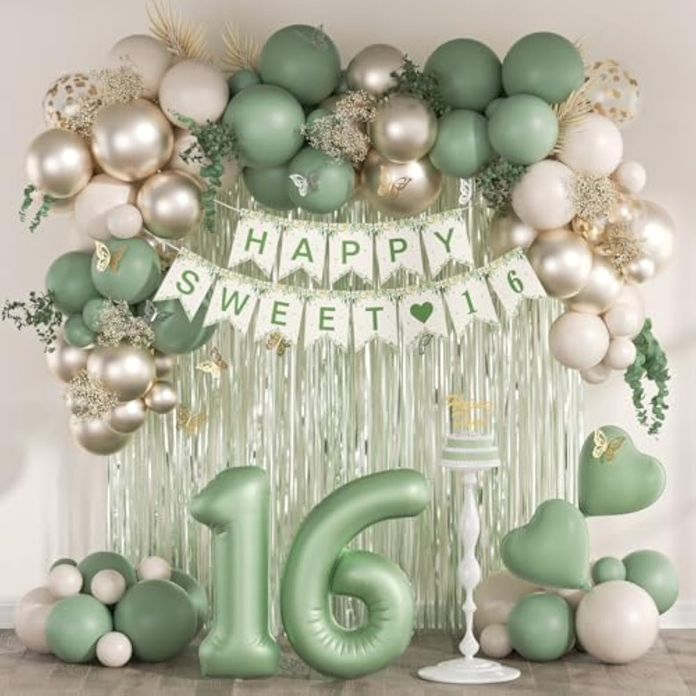| Package Include: The Sweet 16 Decorations Include 20Pcs Sage Green Balloons(10Inchx10, 5Inchx10), 20Pcs Sand White Balloons(10Inchx10, 5Inchx10), 20Pcs Gold Balloons(10Inchx10, 5Inchx10), 12Inch Gold Confetti Balloonsx5, Sage Green Foil Balloonsx2, 32Inch 16 Balloon Numberx1, Sweet 16 Bannerx1, Sage Green Fringe Curtainx1, Glue Dotsx100, Green Ribbonx1, Decorative Stripx1 | | Full Birthday Decoration Set: The All-Inclusive 16Th Birthday Decorations Set Includes A Happy Birthday Banner, Fringe Curtains, And Balloons. Great For Creating A Backdrop Or Photo Booth For Celebrations | | Easy To Use: Sweet 16 Balloons Bring Charm To Your Party, Creating Unforgettable Memories. The Birthday Set Includes Glue Dots And Ribbons For Easy Balloon Arch Setup. Hang Banners And Balloons On Walls, Windows, Or Any Indoor Or Outdoor Space You Like | | Suitable Occasion: The Sweet 16 Party Decorations Is Great For Many Occasion, That Include Sage Green Birthday Decorations, Green And Gold Party Decorations, Sweet 16 Decorations For Girls, Sweet Sixteen Party Decorations, Sixteenth Birthday Party Decorations | | Warm Tips: If There Are Any Issue With The 16 Birthday Decorations For Girls, We Will Work Hard To Solve Them Until You Are Satisfied | |