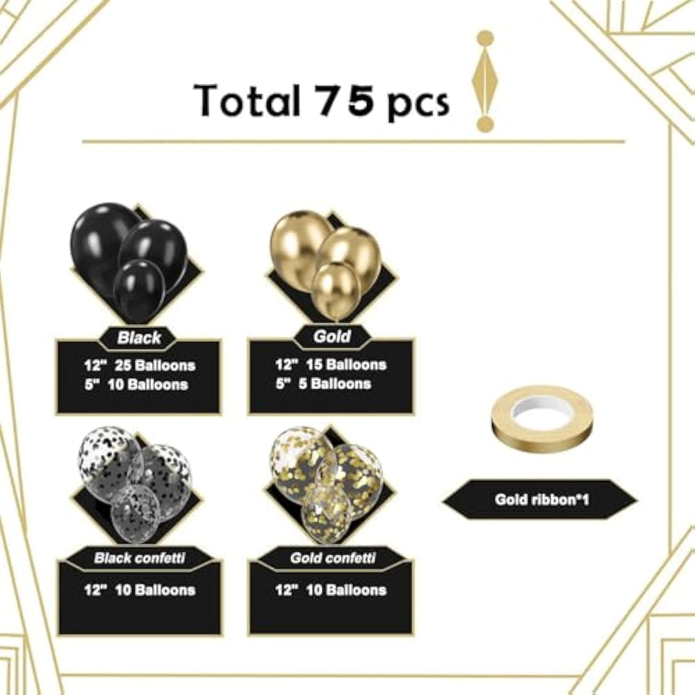 This 75-piece Black and Gold Balloon Set includes a mix of 12-inch and 5-inch latex and confetti balloons—perfect for creating eye-catching balloon arches, garlands, centerpieces, and more. Ideal for birthdays, graduations, weddings, anniversaries, and New Year celebrations, this versatile kit adds a touch of elegance to any indoor or outdoor event. Made from durable, non-toxic latex, the balloons are easy to inflate and decorate with. Simply tie, arrange, or stick them to walls or doors for effortless and stylish party decor.
