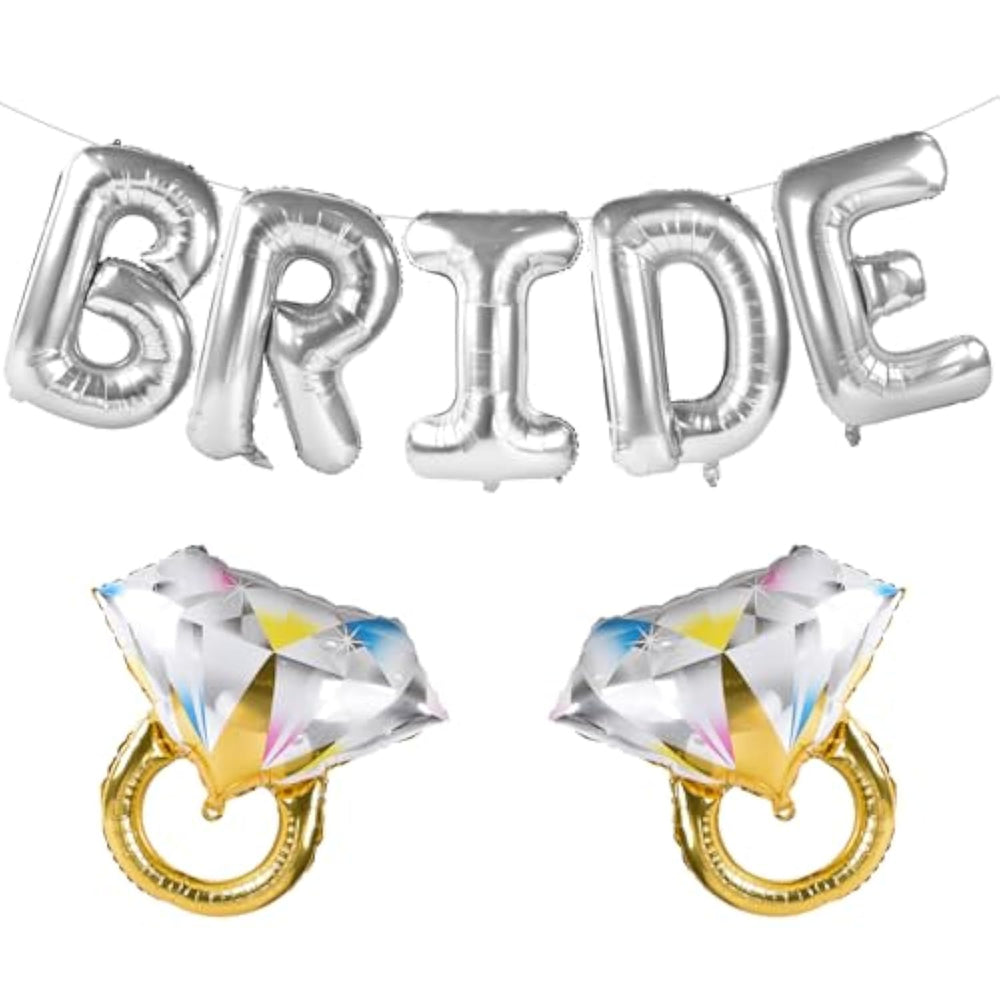 Celebrate the bride-to-be with our Bridal Shower Balloon set, which includes Silver "BRIDE" letter balloons with string, 2 diamond ring balloons, and 1 straw for easy inflation. These balloons are perfect for creating a stunning backdrop, photo props, or table centerpiece at any bridal shower, engagement, or bachelorette party. The 32-inch large "BRIDE" foil balloons and 24x32-inch ring balloons are made from high-quality aluminum foil, ensuring they are shiny, thick, and non-toxic. They can be inflated with helium for a floatable display, adding an extra touch of elegance to your special celebration.
