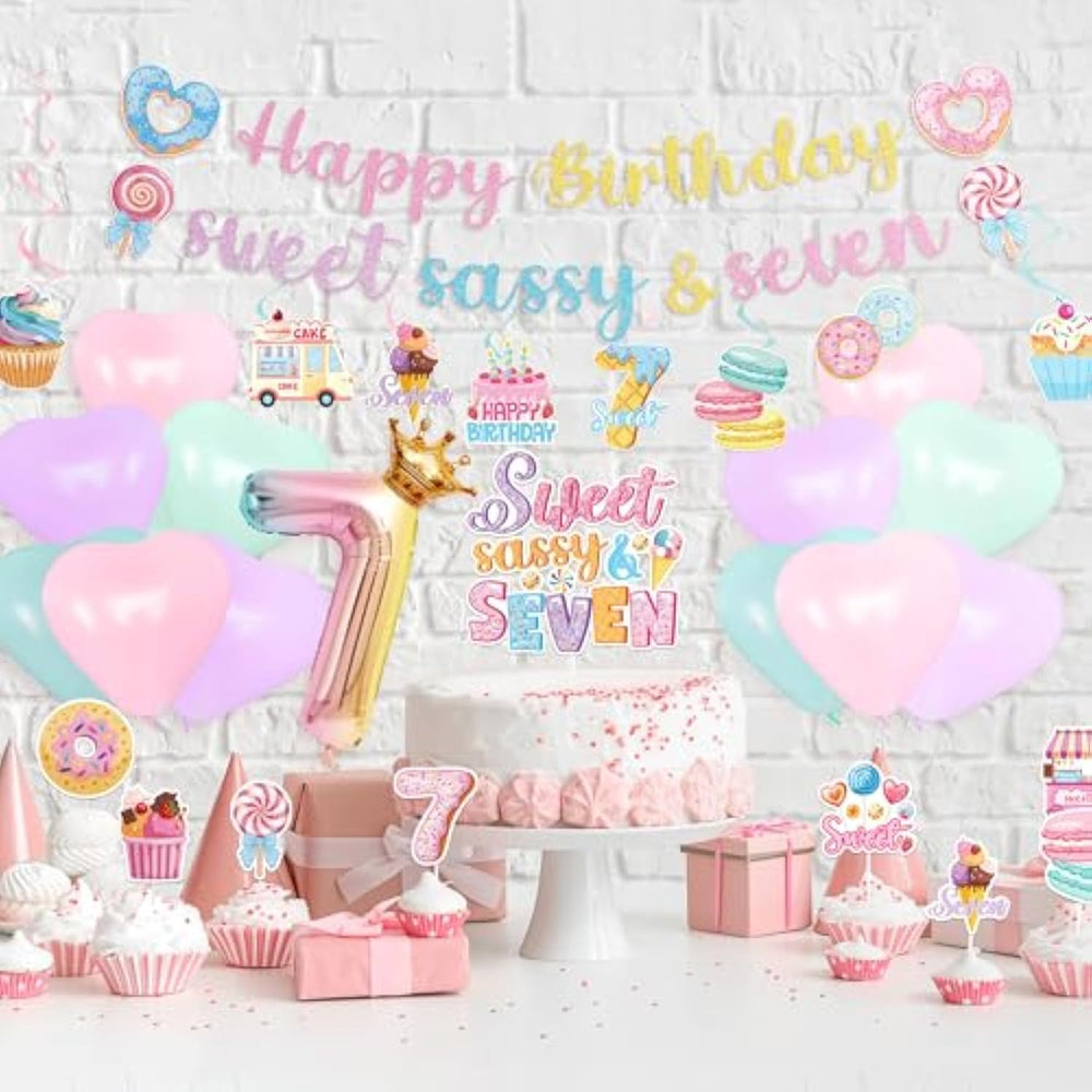 | You Will Get: This 7-Year-Old Birthday Party Decoration Includes 2 Banners, 8 Hanging Swirls, 1 Large Cake Topper, 8 Small Cake Toppers, And 21 Balloons. One Set Meets All Decoration Needs And Easily Creates A Dreamy Party Atmosphere | | Theme Design: Use Exquisite Dessert Elements, Such As Cakes, Donuts, Ice Cream, Etc. To Create A Childlike Birthday Atmosphere. Soft Colors Make The Whole Party Layout More Warm And Dreamy | | High-Quality Materials: Made Of Environmentally Friendly And Paper And Materials, The Colors Are Bright And Resistant. The Decorations Are Lightweight But Sturdy, Providing A Premium Experience Whether For Indoor Use Or Outdoor Party | | Versatile Use: Whether It Is A Seventh Birthday Party Or An Outdoor Party, This Set Can Be Easily Used. Suitable For Arranging On Walls, Ceilings, Dessert Tables, Etc., Making Every Corner Full Of Joy And Ritual | | Easy To Use: It Can Be Easily Hung On A Wall, Doorway Or Ceiling. No Complicated Tools Or Steps Are Required, And It Can Be Quickly Set Up To Create The Perfect Atmosphere For Your Party | |