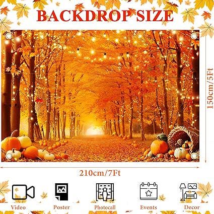 This 7 x 5 ft (210 x 150 cm) fall backdrop features a vibrant autumn forest design with golden maple leaves, pumpkins, and twinkling accents, perfect for Thanksgiving or seasonal photo shoots. Made from durable, wrinkle-resistant material with grommets for easy hanging, it’s ideal for photo booths, family portraits, party decorations, or social media content. Its large size makes a bold statement, transforming any space into a festive autumn setting while adding warmth and charm to gatherings and events.