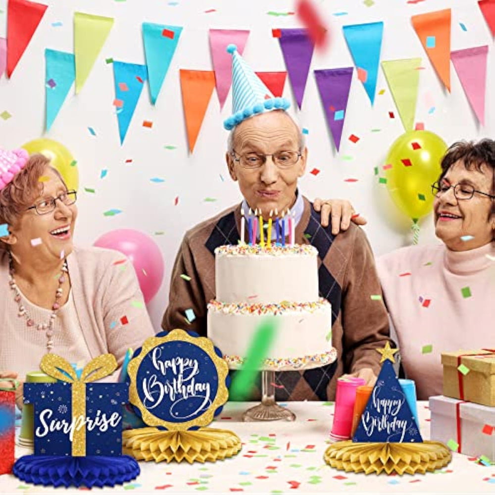This set includes 8 blue and gold honeycomb centerpieces in various stylish designs, perfect for decorating birthday parties or special occasions. Made of quality cardboard with clear printing, they add a chic touch to any celebration. Easy to assemble, simply peel off the sticker, attach the honeycomb ball to the base, and gently unfold for an eye-catching table decoration.