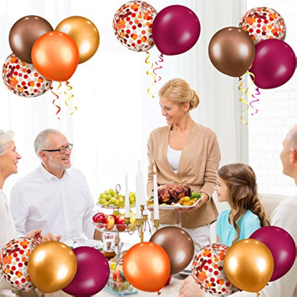 This set includes 80 Thanksgiving balloons, combining solid colors and confetti styles, perfect for creating a full autumn-themed atmosphere indoors or outdoors. The balloons feature a festive fall color palette of orange, purple, and brown, with confetti designs adding a cheerful seasonal touch. Made from durable latex, they are thick, easy to inflate, and resistant to popping, ensuring reliable use throughout your celebration. Measuring 2.36 x 4.72 inches uninflated and up to 12 inches when inflated, they are ideal for ceiling decorations, table accents, or large-scale fall setups.