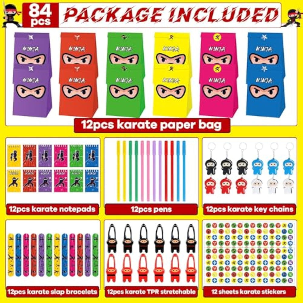 | Karate Party Gifts Set: 12Pcs Colorful Karate Paper Bag For Kids, 12Pcs Colorful Karate Notepads For Boys, 12Pcs Pens, 12Pcs Colorful Karate Key Chains, 12Pcs Colorful Karate Slap Bracelets, 12Pcs Colorful Karate Tpr Stretchy Flying Toys, 12 Sheets Karate Stickers?288Pcs In Total?Are Included. The Abundant Kits And Rich Styles Will Satisfy Your Various Needs And Replacements. | | Reliable Material: These Colorful Karate Party Decorations Are Made Of Reliable Materials, The Colorful Karate Paper Bag And Notepad Are Made Of Thick Paper, Do Not Fade Or Break Easily And Reusable. The Karate Bracelets For Classroom Are Made Of Metal And Key Chains For Birthday Is Made Of Silicone. The Pen Is Cute And Kids Would Like To Write. | | Karate-Themed Design: Our Colorful Karate Party Supplies Set Are Designed In Lovely And Exquisite Styles, With Cute Karate Characters, Which Are Warmly Popular Among Students, And Will Elevate The Party Atmosphere, Creating A Joyful Ambiance. Get Ready To Take Your Birthday Party To The Next Level With These Attractive And Interesting Karate Party Decorations. | | Wonderful Gift: Our Colorful Karate Party Favors Can Be Applied As A Fantastic Gift For Close Friends,Kids,Families. Imagine How Surprised Will Be When Receiving This Gift, Don’T Forget To Capture Their Funny Faces. This Karate Party Decorations Will Making Your Party Memorable. | | Widely Applied: You Can Give These Karate Birthday Party Decorations As Party Favors For Kids,Boys,Birthday Parties, Baby Showers, Classroom Activities, And Various Events, The Colorful Karate Key Chain Can Be Hung On The Bag Or Purse, And The Stickers Can Be Attached To The Arm Or On The Table, Making You Look Cool And Cute, Easy To Be Noticed In The Crowd. | |