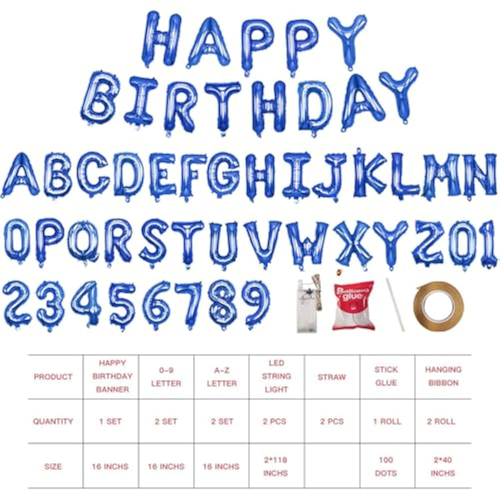 | Personalized Balloon Letters Banner Kit With Name And Number: You Will Get 85 Pieces Of Balloon Letters And Numbers, Including 1 Pack "Happy Birthday" , And 2 Sets "A-Z 0-9" 16-Inch Letters Balloons , 2 Rolls Of "Hanging Ribbon Led Light Strings Slender Straws", And 1 Pack "Glue" For Customizing Your Party Banner | | Suitable For Difference Occasions: Custom Balloon Letters Are Used For Birthday Parties, Baby Showers, Home Parties, Celebrate Graduations, School Seasons, Bachelorette Parties, Engagements, Bridal Showers, And Other Festive Decorations | | Easily Inflate And Deflation: These Happy Birthday Balloons Are Made Of Aluminum Foil Has A Self-Sealing Valve For Easy Inflation And Deflation. Self-Sealing Helps The Balloons Maintain Their Form Without Leaking Or Losing Air | | Custom Your Party Banner: Arrange The Letters And Numbers And Put The Rope Through Each Balloon And Hang It Up Or Stick As A Delicate Decoration. It Is Suitable For Indoor Or Outdoor Walls, Playgrounds, Yards, Etc | | If You Have Any Questions About The Product, Please