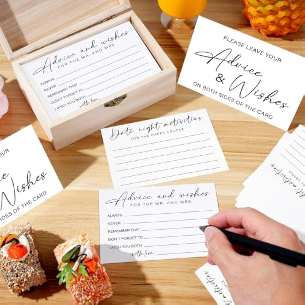 | Weeding Advice And Wish Cards Wooden Box: There Are 80Pcs Wedding Advice And Wishes Cards In The Package,2Pcs Black Pens,1Pcs Wooden Box,2Pcs Folded Instruction Card,So Your Friend And Family Can Have Fun When Giving Advice And Well Wishes For Couple Life'S Big Moments | | Durable Material: Those Bridal Shower Advice And Wishes Cards Are Made Of Premium Thick Cardboard,The Box Made Of Wood,Sturdy And Reliable.The Accompanying Pen Is Made Of Sleek Metal For A Smooth Writing Experience. | | Meaningful And Invaluable Keepsake: Treasure Your Friends Or Family'S Written New Life Advice And Wishes In This Card Box,Every Card Filled With Heartfelt Messages Becomes A Precious Artifact Of The Celebration,This Wedding Wood Box Will Hold All Your Newlyweds Wishes And Suggestions,Will Bring A Smile To Your Face Every Time You Remember | | Wedding Card Box Set Dimension: Our Advice And Wishes Wood Card Box Measures Approximately 6 X 4 X 2.7 Inches,80Pcs Wish Cards Measures 4.7 X 3.1 Inches. Pen Measures 5.4Inch.Our Advice And Wishes Card Box Can Be Used As A Wonderful Decoration For Your Wedding Party. | | Weeding Bridal Shower Party Decorations: This Set Of Advice Card Wooden Box Can Be Applied During Wedding Or Bridal Shower Party Game To Encourage Guests To Write Blessings,Allow Guests To Share Anything And Immortalize Memories.Or As Decorations In The Wedding Reception Areas.Whether On The Wedding Day Or Future Anniversaries, When You Opening The Wooden Box,The Cards Will Bring You Back Cherished Moments | |