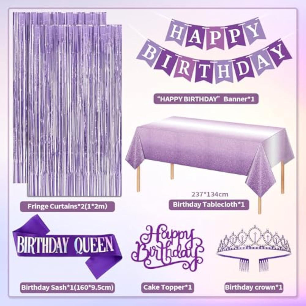 This 86-piece purple birthday decoration set includes 15 purple balloons, 15 pink balloons, 10 metallic purple balloons, 10 light purple metallic balloons, 10 pink and purple confetti balloons, 2 purple star balloons, a purple birthday sash and crown, 4 paper pompom flowers, a purple happy birthday banner, a purple tablecloth, 2 light purple metallic fringe curtains (1x2m), 6 purple hanging swirls, 10g purple silver confetti, a cake topper, and 2 ribbons. Made of high-quality latex, the balloons are durable and easy to assemble, while the metallic fringe curtains add a sparkling touch. Perfect for birthdays of all ages, from 13th to 80th, this pink and purple party set creates a dreamy and unforgettable atmosphere for women and girls.