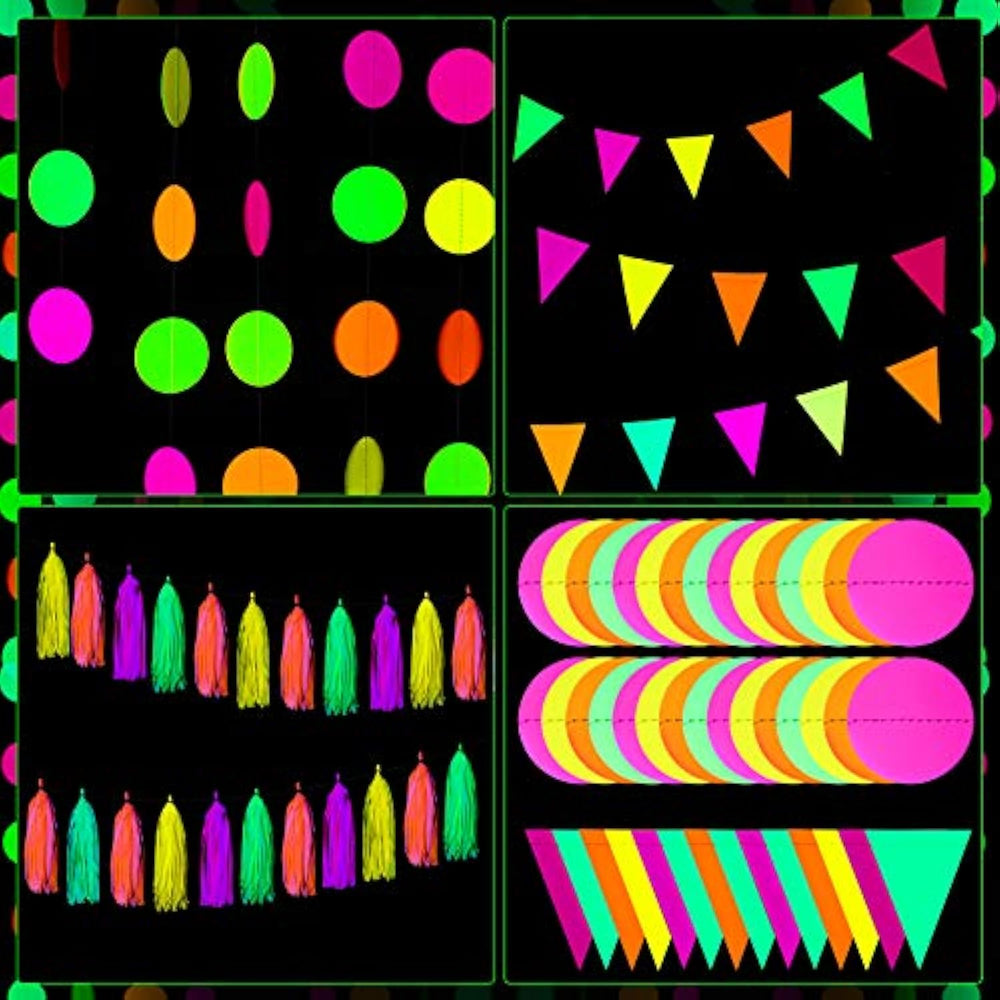 | Ideal For Fluorescent Party: If You Want To Decorate Your Night Party, This Product Is A Very Good Choice, Pulling The Banner Under The Fluorescent Light Will Give Out Bright Colors, Very Attractive, Hanging On The Wall Can Make Your Party Full Of Atmosphere | | What You'Ll Get: You Will Get 20 Pieces Fluorescent Paper Tassels Garland With 4 Colors: Yellow, Green, Orange, Rose, And 2 Pieces Neon Paper Garlands And 1 Piece Neon Triangle Flags Bunting, There Are Enough To Meet Your Decoration Needs And Make Your Fluorescent Party More Charming | | Reliable Quality: The Quality Of The Fluorescent Party Decorations Is Nice, The Circular Neon Paper Garland, Neon Triangle Flags Bunting And Neon Paper Tassels Are Made Of Quality Fluorescent Paper, The Edges Of The Paper Are Cut Very Smooth, And When The Fluorescent Lights Shine On The Paper, The Color Is Very Eye-Catching | | Product Size: The Size Of The Fluorescent Party Decor Is Wide, With 5 Paper Tassels Forming A Paper Tassel, A Neon Paper Tassel Is 14.5 X 9.5 Inches, A Circular Neon Paper Garland Is 78 Inches Long, A Circle Is 2 Inches In Diameter, A Neon Triangle Flags Bunting Is 118 Inches Long, A Pennant Is 2.5 Inches In Diameter | | Wide Range Of Use: Fluorescent Party Decor Can Be Applied Not Only For Fluorescent Parties But Also For Birthday Parties, Weddings, Graduation Parties, Most Parties You Want To Make A Good Memory Of Can Be Decorated With These Banners | |