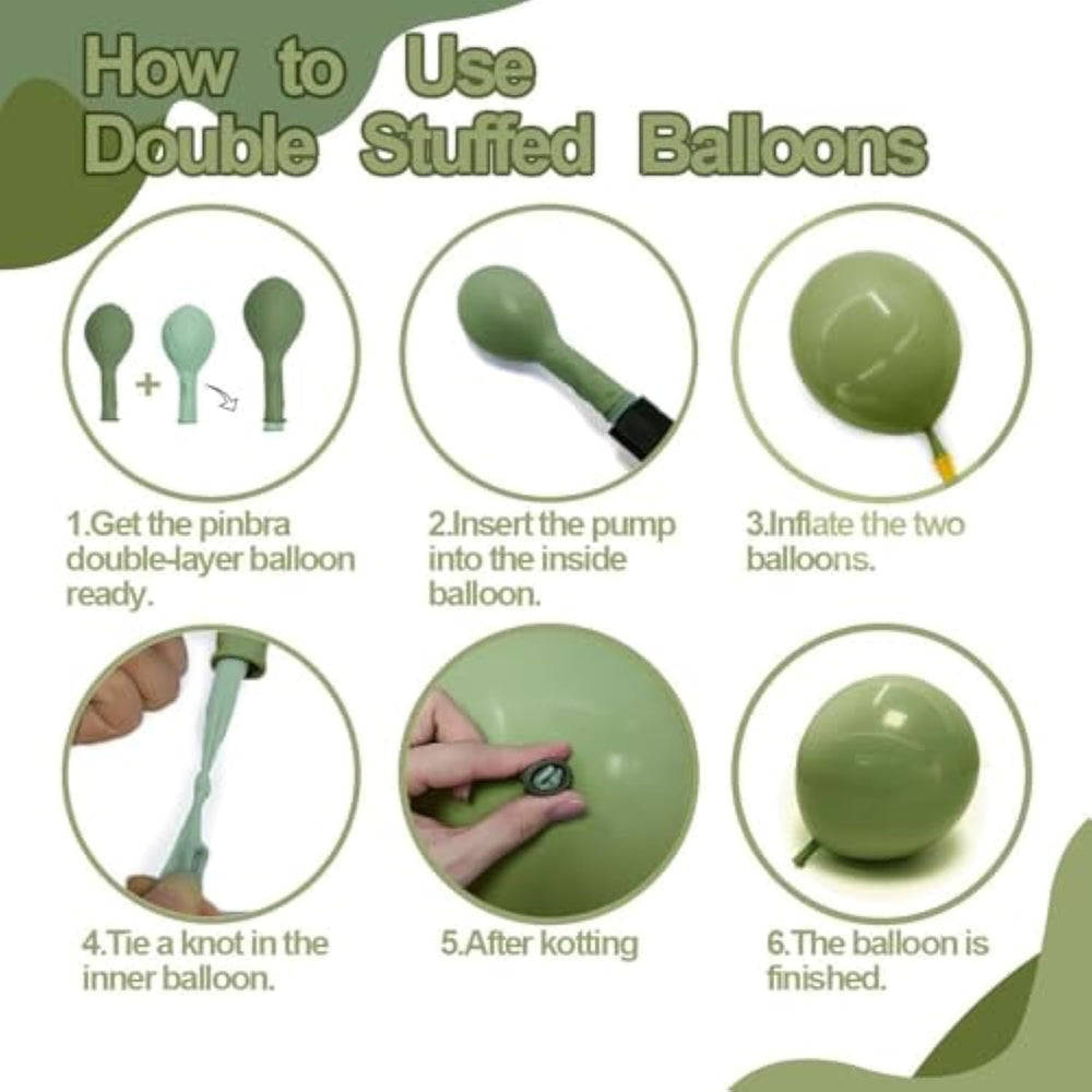 This green and white balloon garland kit features double stuffed sage green dusty green pearl sand white and pearl green balloons along with light green gold balloons in multiple sizes to create a full and layered look The high quality latex material provides increased durability making the balloons less likely to pop and ideal for long lasting events The kit includes 16ft balloon strip tape 100 glue dots and a 33ft curling ribbon for easy assembly with step by step instructions Whether for a birthday baby shower bridal shower wedding or jungle safari party this sage green white and gold balloon arch adds a romantic and elegant touch to any celebration.