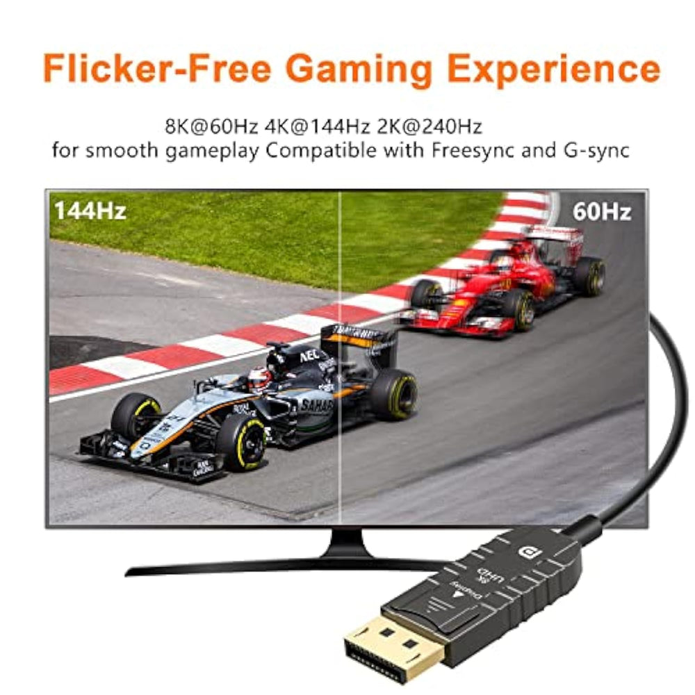 8K Fiber Optic Displayport Cable 1.4 Male To Male Ultra High Speed Displayport 1.4 Cables Support Resolution Up To 8K (7680X4320) Including 5K (5120X2880) @60Hz, 4K Ultra Hd (3840X2160 @ 144Hz) And 1440P 2K@165Hz,1080P@240Hz. Featuring 100% Real 8K Quality, Each Cable Is Individually Tested To Supports The Highest Standard Of Displayport Cable 1.4. 8K Uhd Displayport 1.4 Cable 8K@60Hz(7680X4320P@60Hz);4K@144Hz;2K@165Hz 32.4 Gbps Bandwidth Hbr3, Cec, Edid, Hdcp2.2,Hdr10 4:4:4 3D Format,32 Audio Channels Backwards Compatible With Displayport 1.3/1.2/1.1. High Reliability Materials Advanced Chiphigh Quality Glass Fiber 24K Gold-Plated Connectors