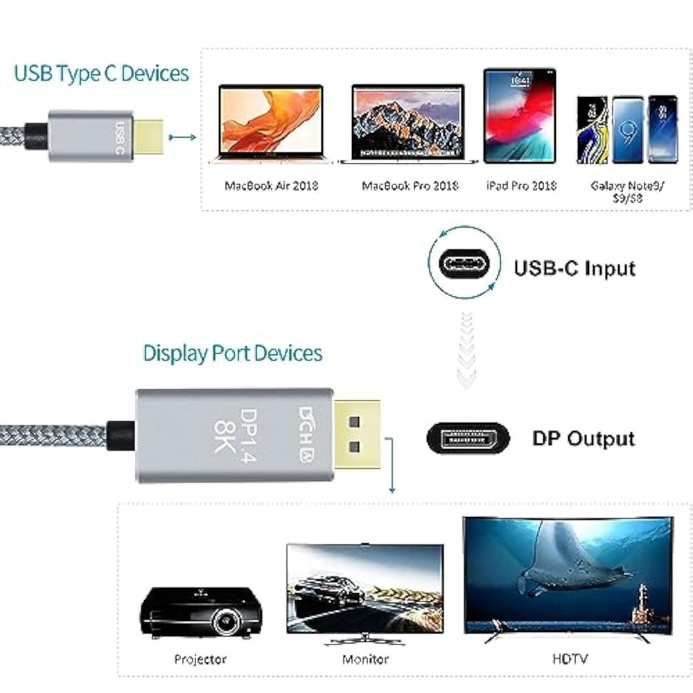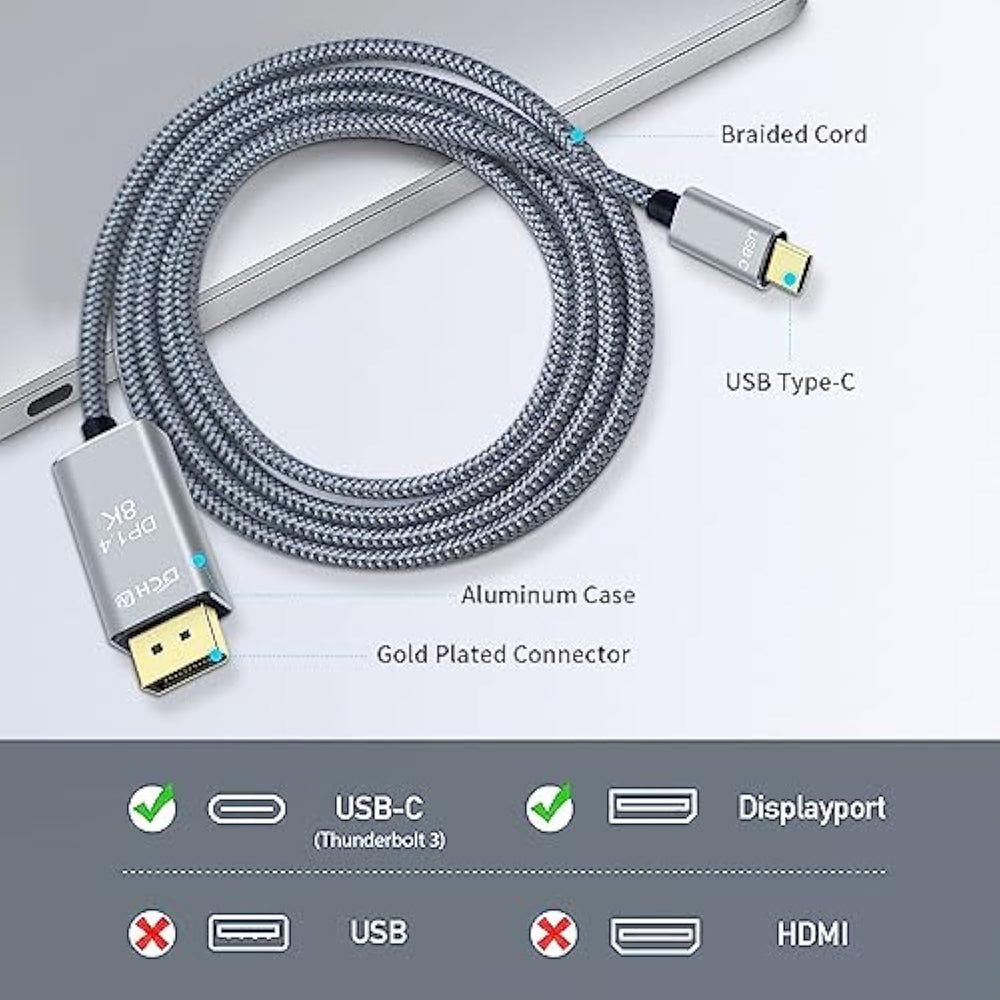 | 6Ft Usb To Displayport Cable For Monitor Connects Cell Phone, Tablet, Computer To Monitor, Hdtv, Projector Or Other 8K Displayport Displays For Video Streaming And Flawless Gaming | | Hdr Usb C To Displayport 1.4 Cable Supports High Resolutions Up To 8K@60Hz, 5K@60Hz, Ultra Hd 4K@144Hz, Uhd 4K@120Hz, 2K@240Hz / 165Hz / 144Hz High Refresh Rate And 1536Khz Audio; Hbr3, Dsc, Fec, Hdcp 2.2 /1.4 And Windows Pc Mst | | Home Office Dual Monitor Setup: Mirror Display, Extend Display And Multi-Screen Splicing Mode; Plug And Play, No Driver Needed; Usbc Port Requires Display Port 1.4 Alt Mode To View Video Over Type C Connector (Not All Usb C Ports Converter Support Alt) | | Nylon Braided Usb To Display Port Adaptor Cord Is Slim Flexible, Lightweight; Gold-Plated Interface Conducts Faster; Gray Usb-C To Dp Cable In Aluminum Housing For Durable Use | | 6 Feet Usb-C To Dispayport Adapter V1.4 Is Compatible With Thunder Bolt 4/3 Macbook Pro, Imac, Google Pixelbook, Dell Xps 15, Hp Spectre, Samsung Note9, Mac Mini, Ipad Pro, Tv, Docking Station, External Monitor And Projector For Video And Audio Transfer | |