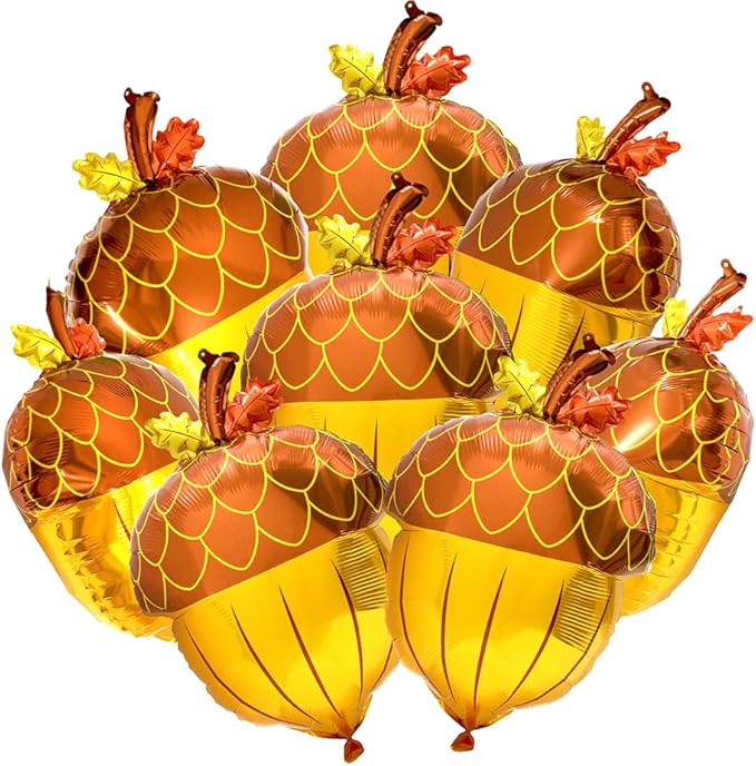 This set includes 8 brown 3D pine cone foil balloons, each about 25.2" tall and 16.5" wide uninflated, with double-sided printing and extra thickness. The balloons feature a self-sealing valve for easy inflation and are reusable for future fall or forest-themed decorations. They can be filled with air or helium to float, and come with 2 rolls of ribbon (32.8 ft and 10 m) for hanging or tying. Perfect for Thanksgiving, fall parties, birthdays, baby showers, carnivals, or holiday decor, these balloons can be used indoors or outdoors and combined with other decorations to create festive, seasonal displays.