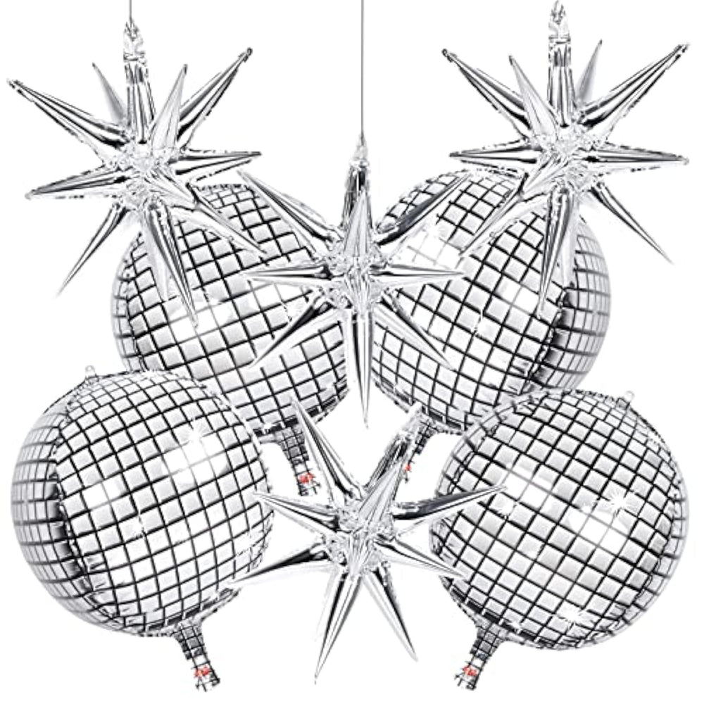 These 22-inch silver disco ball balloons are eye-catching and perfect for 70s-themed parties, New Year’s Eve, birthdays, graduations, or any celebration needing a retro sparkle. Made from durable polyester film, they’re easy to inflate with air, self-sealing, and reusable. The set includes 3D foil star balloons for extra shine, adding a stylish touch to arches, backdrops, or floor displays. Bright, bold, and versatile, they’re a standout addition to any event.