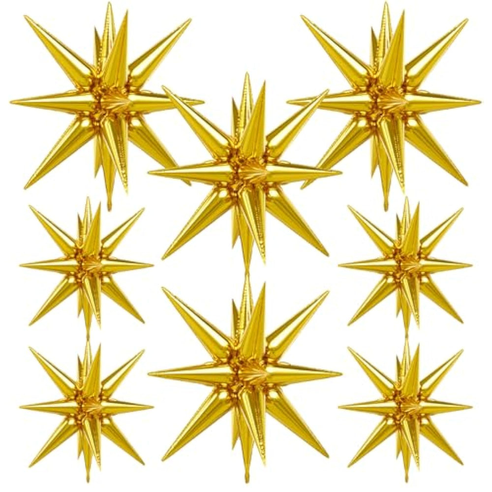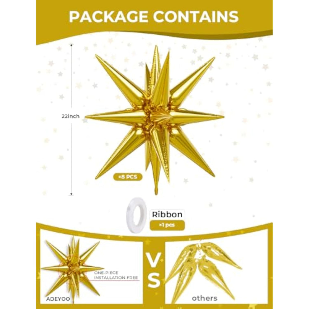 | 4D Gold Balloons Foil: You Will Get 8 Pcs 22Inch Gold Starburst Balloons,1 Piece Of Ribbon. You Can Place The Star Balloons In Any Place, Adding An Eye-Catching Touch To Your Party. | | Magic Star Balloons: These Gold Spike Balloons Are Made Of Aluminum Film Material, Making The Gold Foil Balloons Look Shining, Exquisite, Sturdy And Keep Inflated For A Long Time. The Shining And Exquisite Design Adds More Color To The Party. | | Easy To Assemble: These Gold Explosion Star Balloons Can Seal Themselves And Do Not Need To Be Tied. Unlike Other Gold Star Balloons, Our Exploding Star Balloons Are One-Piece And So You Don'T Have To Assemble Them. Just Press The Self - Sealing Tail.In Just One Minute, The Star Balloons Are Completed! It'S That Simple. | | Mylar Star Balloons: The Foil Star Balloons Can Be Hung, Used To Decorate The Party Backdrop, Or Combined With Various Balloons. The Shiny Explosion Star Balloons Are Ideal For Any Theme Party Decorations Like Birthday, Valentines Day, New Years, Thanksgiving, Halloween, Christmas, Graduation Ceremony, Engagement, Wedding, Anniversary, Bachelor/Bachelorette Party, Bridal Shower, Baby Shower, Gender Reveal Party, Back To School Party, Friendsgiving, Retirement Party. | | Buy With Confidence: Thank You For Shopping With Us! If Your Gold Explosion Star Balloons Are Damaged Or You Are Unsatisfied In Any Way, Please Feel Free To