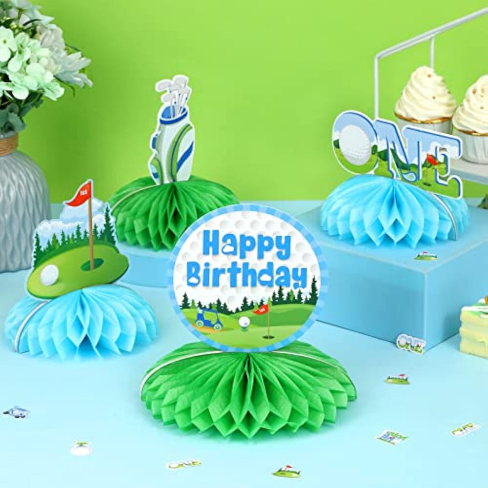 This set includes 8 pieces of 1st birthday golf-themed honeycomb centerpieces in light blue and green. Each double-sided card features golf ball patterns and the phrases "Hole in One" and "Happy Birthday," with a 3D honeycomb paper base. Designed for a 1-year-old boy's birthday, these decorations enhance the party atmosphere with their creative sports theme. Made with high-quality printing technology, they are durable and can be placed on the cake table, gift table, or any party setting for a stylish and festive touch.