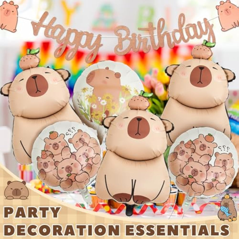 | Complete Package: You Will Receive 9 Pcs Of Capybara Party Decorations Including 1 Capybara Banner, 4 Capybara Shaped Balloons, And 4 Round Balloons; This Set Meeting Most Of Your Party Needs, Will Help You To Create A Coordinated And Stylish Party | | Sturdy Material: The Banner Made From Glitter Paper, Provides A Shiny, Eye-Catching Appearance; The Balloons Made From Aluminum Foil, Are Durable And Ensured Not To Fade, Deform, Or Break; Enjoy Long-Lasting Party Decorations That Will Serve For Long Time | | Suitable Size: The Capybara Banner Spans A Length Of About 12 Ft, While The Capybara Shaped And Round Balloons Measure About 21X13 Inches And 21X18 Inches, Respectively; These Party Decorations Come In Vibrant Designs That Add A Cheerful Tone To Party | | Time-Saving Pre-Assembled Banner: Why Waste Time Assembling When Your Party Awaits! Our Capybara Banners Are Ready-Made And Can Be Hung Effortlessly Wherever You Desire- Be It The Ceiling, The Wall, Or Branches; Dive Straight Into The Merry-Making | | Wide Applications: Our Capybara Birthday Party Decorations Are Ideal For Various Occasions; Apart From Capybara And Wild Animal Themed Parties, They Are Suitable For Cute Animal Party And Can Also Serve As An Anniversary Gift For Your Near And Dear Ones | |