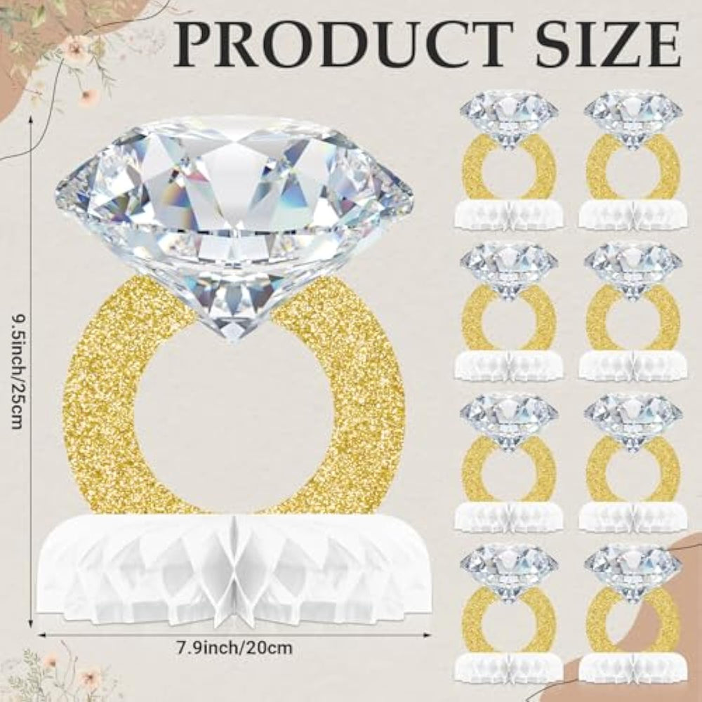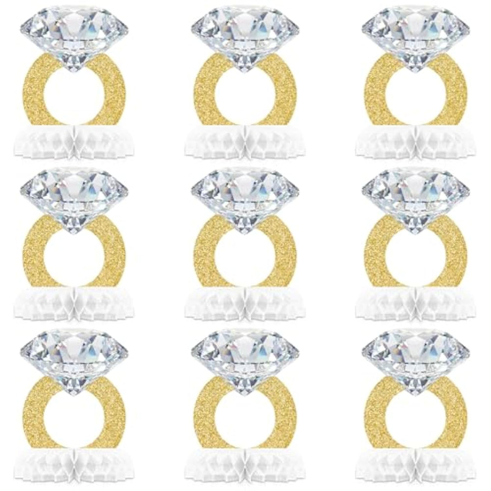| Package Includes: You Will Get 9 Pieces Diamond Ring Honeycomb Cards And 9 Pieces Of White Bases, Enough Quantity And Styles Can Easily Meet Your Various Decoration Needs, Making Your Party Table More Interesting And Impressive, The Honeycomb Diamond Ring Will Sparkle And Shinning Your Party | | Quality Material: The Honeycomb Diamond Ring Hanging Decoration Are Made Of Thick And Sturdy Paper Material, Non Toxic, Not Fade Easily, And Odorless, Safe And Reliable, Sturdy And Reliable, Light In Weight And Tear Resistant, Laminated On The Surface And Exquisite Printing Technology, Reusable And Easy To Store, Allowing You To Use These Honeycomb Centerpieces With Confidence | | Size Detail: The Honeycomb Ring Cards Approx. 7.9 X 9.8 Inches, And The White Bases Measures 7.9 X 2 Inches, The Suitable Size To Meet Your Party Decoration Needs, You Can Also Hang It Wherever You Want It To Be | | Easy To Assemble: The Diamond Ring Paper Centerpieces Only Need To Take A Few Seconds To Finish The Assembly According To The Picture, Tear Down The Sticker At The Bottom Of The Table Centerpieces And Unfold The Base, Paste Two Sides Together, Then Put It On The Display Area, We Are Also Equipped With Paper Clips For Reinforcement, You Don'T Have To Worry About It Falling Apart | | Wide Application: Our Honeycomb Diamond Ring Decor Is Suitable For Many Scenes, Ideal For Engagement Party, Bachelorette Party, Bridal Shower, Wedding Party And Wedding Anniversary Party, Engagement Party Photo Booth, And So On | |