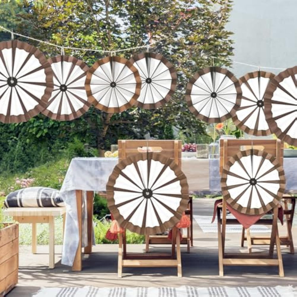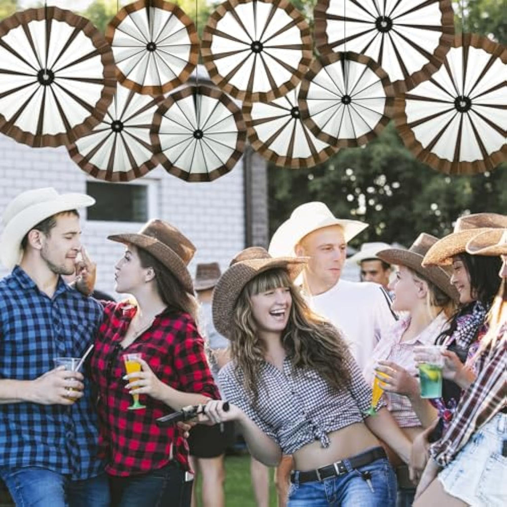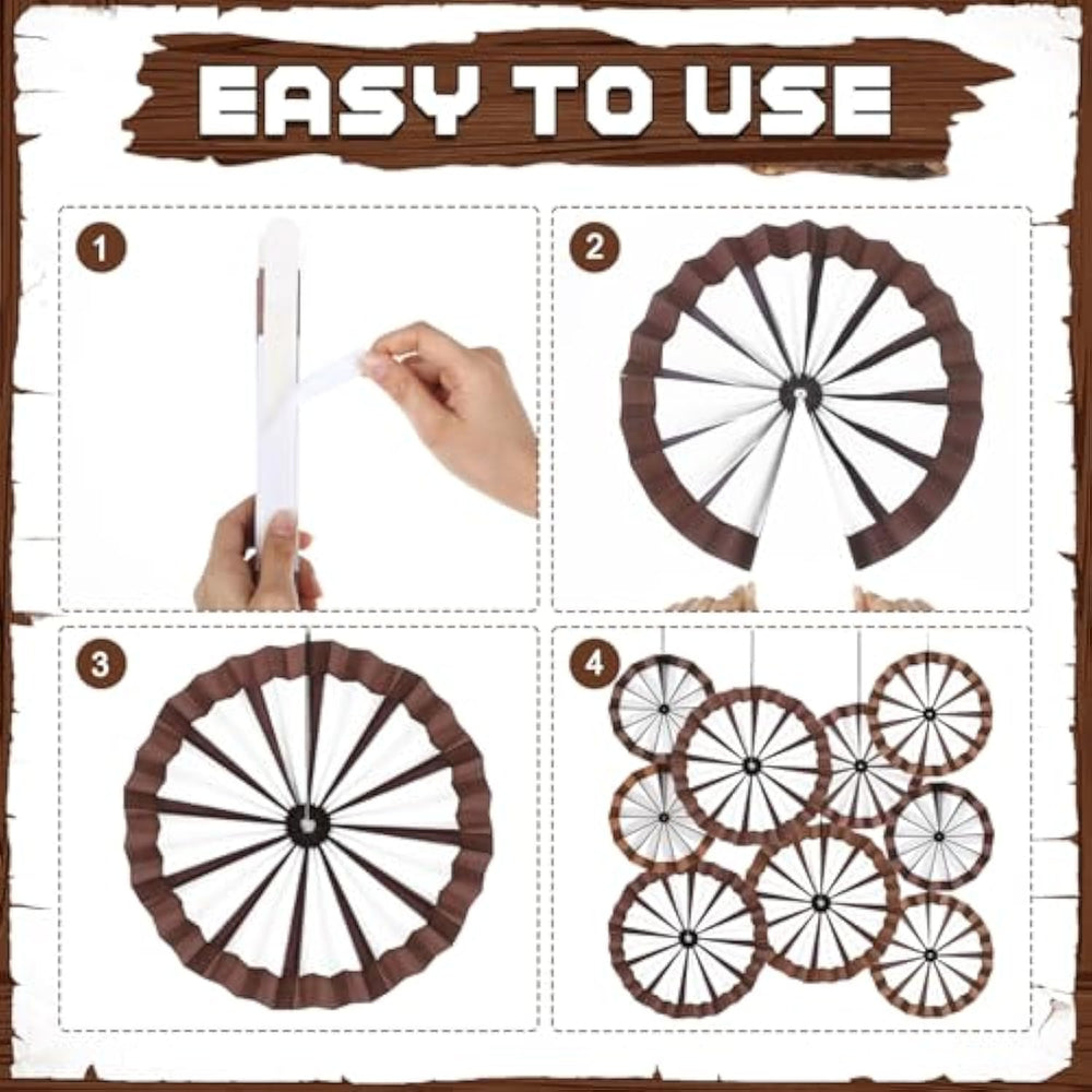 | Package Includes: You Will Receive 9 Pieces Of Wagon Wheels Decorations Paper Fans In Different Patterns, Available In 3 Sizes, Rich Quantity And Sizes Hanging Together For A Visual Display, Which Can Add A Happy Atmosphere To Your Western Party | | Appropriate Fans Size: There Are 3 Different Size Of Old Wagon Wheels Decor For You To Choose, About 8 Inch/ 12 Inch/ 16 Inch, 3 Pieces In Each Size, The Proper Size Will Match Well With Other Western Party Supplies | | Easy To Assemble: You Simply Unfold Each Western Classroom Decorations And Secure With The Sealing Sticker On The Back Of It, Or Use A Gift Paperclip; And There Is Also A Hang Line On Each Paper Fan That Allows You To Hang It Anywhere | | Quality Material: Our Rustic Wagon Wheel Decorations Are Made Of Thickened Paper, Not Easy To Tear And Fade, Each Paper Fan In This Set Is Designed To Closely Resemble Real Wooden Wagon Wheels, Capture The Essence Of The Old West | | Wide Application: These Wooden Wagon Wall Decor With Classic Color And Delicate Style On Wheels Are Suitable For Bedroom, Gardens, Patios, Bars, Balconies; Whether You'Re Hosting A Cowboy-Themed Birthday Party, A Wild West-Inspired Classroom Event, Or A Western-Style Wedding, These Hanging Paper Fans Are Sure To Make A Lasting Impression On Your Guests | |