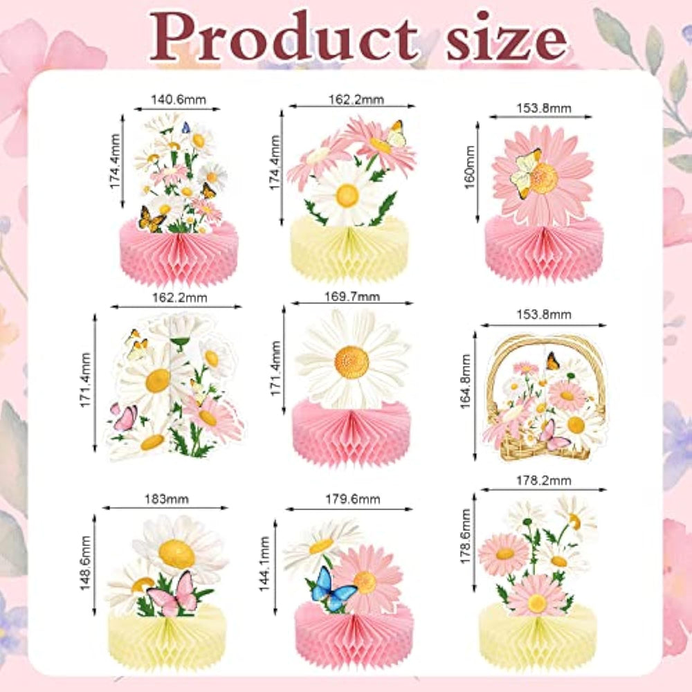 This set includes nine pink daisy and butterfly honeycomb centerpieces in different adorable designs, making them a charming addition to birthday parties, baby showers, gender reveal celebrations, and floral-themed events. Featuring bright white and pink colors with vivid double-sided prints, these decorations add a cute and stylish touch to any table. Made from thick and sturdy cardstock, they are durable, resistant to wear and fading, and designed for long-lasting use. Perfect as both table decor and keepsakes, these daisy and butterfly centerpieces create a fun and cheerful atmosphere for any celebration.