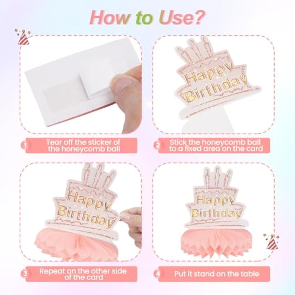 Made from high-quality paper, these sturdy rose gold pink centerpieces stand firmly on the table without risk of falling or fading. Featuring double-sided printing, they are versatile and easy to place anywhere to create the perfect birthday atmosphere. Setting them up is simple—just peel off the stickers from the honeycomb pieces and attach them, taking only a few minutes to complete the installation. The package includes nine different rose gold table centerpieces, making them ideal for any birthday celebration.
