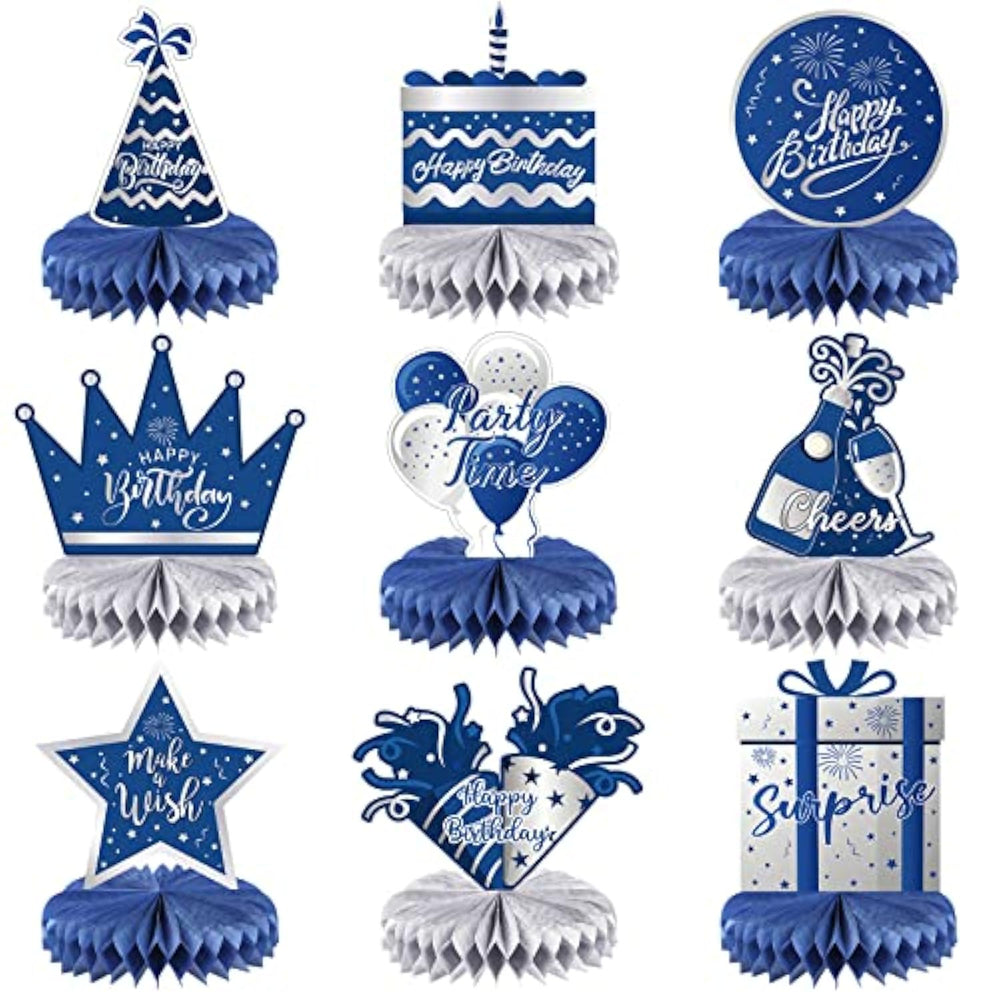 Birthday Honeycomb Decor: There Are 9 Sets Of Navy Blue And Silver Birthday Tabletop Honeycomb Decorations That Can Be Applied In Different Styles Of Tables, The Patterns Include Classic Elements Such As Cakes, Gift Boxes, Cupcake Hats; There Are Plenty Of Them So You Can Make The Most Of Them And Create A Great Birthday Party Atmosphere | Reliable Materials: These Blue Silver Birthday Honeycomb Centerpieces Are Made Of Reliable, Sturdy Cardstock With Sophisticated Printing Techniques, So They Are Strong And Durable For Long Term Use; Moreover, These Birthday Tabletop Decorations Are Safe, Making Them Your Party Favorite Great Decoration | Beautiful Patterns: There Are Many Beautiful Patterns On The Birthday Table Centerpieces Ornaments, And The Patterns Have Some Words On Them, Which Matches The Aesthetics Of Most People; And These Patterns Look More Childish And Cute, Can Create A Festive And Active Party Atmosphere | Easy Assembly: First, You Need To Peel The Sticker Off The Honeycomb Ball, Then Stick It On The Fixed Area Of The Card, Then Put Another Honeycomb Ball On The Other Side Of The Card, And Finally, The Navy Blue Birthday Honeycomb Centerpiece Is Assembled Finished | Wide Applications: Decorating A Party With These Birthday Honeycomb Table Decorations Is A Great Idea, It Is Suitable For All Kinds Of Birthday Parties, Activities And So On; Not Only Can They Be Applied To Decorate Table Tops, Refrigerators, Etc., But They Can Also Be Hung For Use |