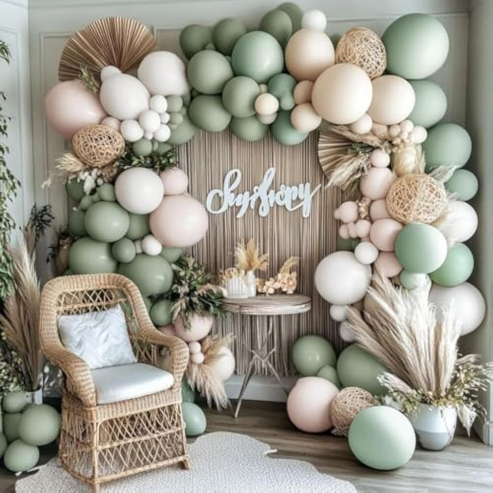 Create a stunning, neutral-toned party atmosphere with this Dusty Green Double Stuffed Balloon Set. This kit includes double-layer dusty green balloons (5"x10, 12"x15, 18"x2), light green balloons (12"x10), sand white balloons (12"x10, 18"x2), and white balloons (12"x10, 18"x2), along with sand white, white, and cream balloons (5"x10, 5"x10, 10"x15). It also comes with a 16 ft balloon strip tape, 100 glue dots, and a 33 ft white curling ribbon. The versatile and elegant mix of colors—olive green, beige, sage green, and white—adds a gorgeous touch to any celebration. Easy to inflate with air or helium, this kit includes all the necessary accessories to help you effortlessly assemble a beautiful balloon garland. Made from high-quality latex, these balloons are safe, non-toxic, and durable, lasting up to 72 hours. Perfect for jungle theme parties, woodland baby showers, graduations, weddings, birthdays, safari garden parties, or any neutral-themed event, this balloon set will elevate your decorations and create an unforgettable backdrop.