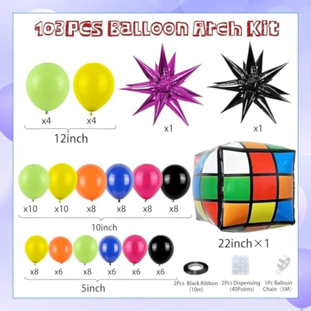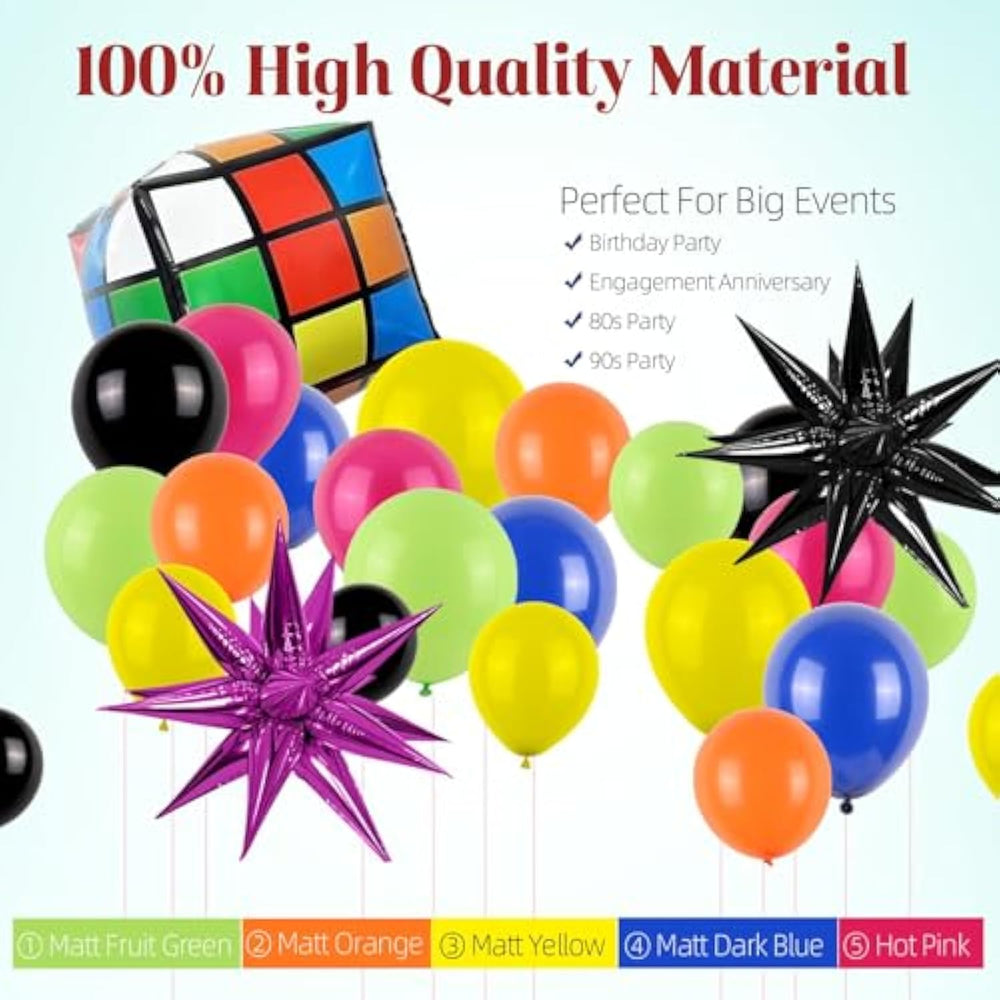 | Back To The 80S 90S Balloon Arch: This 80S 90S Balloon Garland Kit Includes: Fruit Green Balloons (4X12In, 10X10In, 8X5In), Yellow Balloons (4X12In, 10X10In, 8X5In), Hot Pink Balloons (8X10In, 6X5In), Blue Balloons (8X10In, 6X5In), Orange Balloons (8X10In, 6X5In), Black Balloons (8X10In, 6X5In), Black Star Balloon (1X22In), Hot Pink Star Balloon (1X22In), 4D Dice Balloon?1X22In?, Black Ribbons (2X32Feet), Along With A Balloon Strip And 2 Dispensers. | | Premium Materials: Our 90S 80S Theme Balloons Are Made From Top-Notch Latex And Foil. Thick Material Makes Them Won'T Burst Easily. Whether You Choose To Fill Them With Air Or Helium, They Will Maintain Their Shape Over Time. | | Easy To Assemble: We'Ve Included Two Handy Tools, A Balloon Chain And Dispensers, To Simplify The Process. Just Inflate The Balloons, Slip Them Into The Slots On The Balloon Chain, And Get Creative With Mixing And Matching Colors And Sizes. Utilize The Balloon Dispensers To Secure Smaller Balloons To Larger Ones Effortlessly. This User-Friendly Process Lets You Have The Beautiful Back To The 90S 80S Balloon Arch Ready In Just 30 Minutes To An Hour. | | Versatile Use: Elevate The Style At Your Party With This Chic 90S 80S Balloon Arch Kit. It'S The Nice Choice For Various Occasions, Including 80S Parties, 90S Parties, Back To The 80S Parties, Back To The 90S Parties, Birthday Parties, Classmate Reunion Parties, Nostalgic Theme Parties, Weddings, And Anniversaries. Whether You'Re Enhancing The Atmosphere Indoors Or Outdoors, Or Setting Up A Photo-Worthy Backdrop, This Nostalgic Theme Party Balloon Kit Ensures You Host A Memorable Event. | | Warm Tips: Avoid Overinflating The Colorful Party Balloons And Steer Clear Of Direct Sunlight, Heat, Sharp Objects, And Excessive Rubbing To Ensure Their Longevity. If You Have Any Questions Or Concerns About Our Party Balloons, Don'T Hesitate To Reach Out. We'Re Here For You And Will Respond Within 24 Hours, Ready To Assist You And Ensure You'Re Satisfied With Both The Products And Service. | |