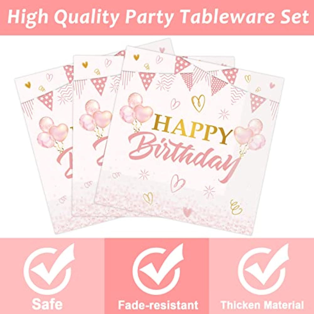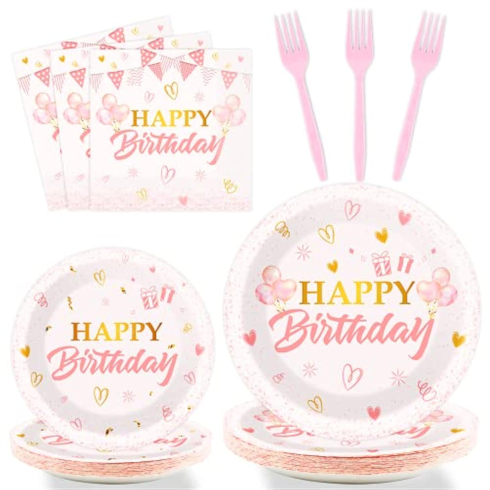 Enhance your birthday celebration with this elegant 96-piece pink and rose gold tableware set, perfect for stylish party decorations. Designed for 24 guests, it includes dessert plates, napkins, forks, and party favors, each with a beautiful glossy finish that adds a sophisticated touch. Made from high-quality, durable paper, this disposable set ensures easy cleanup while maintaining a chic look. Ideal for women's birthday parties, it provides a convenient and stylish way to serve guests while creating a memorable table setting.