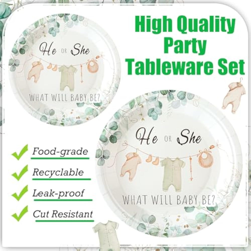| Greenery Baby Shower Party Supplies: You Will Receive 24 Pieces 9 Inch Greenery Gender Reveal Plates, 24 Pieces 7 Inch Small Plates, 24 Napkins, And 24 Forks; This Set Of Greenery Baby Shower Party Supplies Totals 96 Pieces, Bringing Surprises For You, Your Family, And Friends | | Ideal Design: Our Small Greenery Gender Reveal Tableware Are A Nice Choice To Decorate A Boy Or Girl Fall Gender Reveal Party; Using Green As The Main Colors, Paired With Greenery Leaves And Other Baby Shower Elements, It Is Attractive | | Reliable Material: Greenery Gender Reveal Party Supplies For Boys Or Girls Are Made Of Paper, Including Paper Gender Reveal Plates, Napkins, The Material Is Safe And Reliable, The Small Greenery Plates Are Sturdy And Can Hold A Lot Of Food; The Patterns And Colors Are Beautiful Printed And Fade Resistant | | Save Time: The Greenery Gender Reveal Tableware Are Disposable, Reducing Your Party Prep Time And Can Be Thrown Away After Use, Saving Cleanup Time So You Can Spend More Time With Friends And Family Enjoying Party Together | | Wide Application: These Greenery Gender Reveal Party Decorations Are Suitable For Many Occasions; This Baby Shower Dinnerware Are Suitable For Gender Reveal Parties, Baby Showers, Pregnancy Announcements, Wedding Themed Parties, Birthdays, Christenings | |