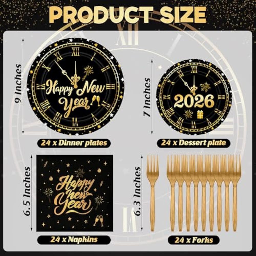 | What You'Ll Receive: You’Ll Get 24 Pcs New Years Eve Party Plates Dinner Plates (9 - Inch), 24 Pcs Nye Plates Dessert Plates (7 - Inch), 24 Pcs Napkins (6.5 - Inch) With “Happy New Year” Design, 24 Pcs Golden Plastic Forks (6.2 - Inch). | | Stylish Design: Featuring Exquisite Golden Clock And “Happy New Year” Elements On A Sleek Black Background, Our New Years Eve Party Plates Radiates An Elegant And Luxurious Atmosphere, Enhancing The Sophistication Of Your 2026 New Year Decorations. | | Hassle - Free Disposal: After The Party, Just Dispose Of These Happy New Year Plates, Skipping The Tedious Dishwashing And Cleaning. This Way, You Can Spend More Time Enjoying The New Year Celebration, And They Match Well With Other New Year Party Supplies You Like. | | Premium Materials: The Nye Plates And Napkins Set Are Made From High - Quality Paper, Which Is Sturdy And Won'T Fade, Leak Or Break. The Napkins Are Soft To Use. The Golden Forks Are Made Of Non - Toxic Plastic, Ensuring Safety. | | Suitable For Many Events: These New Years Eve Party Plates And Napkins Aren'T Just For New Year'S Eve. They'Re Also Suitable For Birthday Parties, Family Dinners, And Outdoor Events, Our Happy New Year Plates And Napkins Perform Well. | |