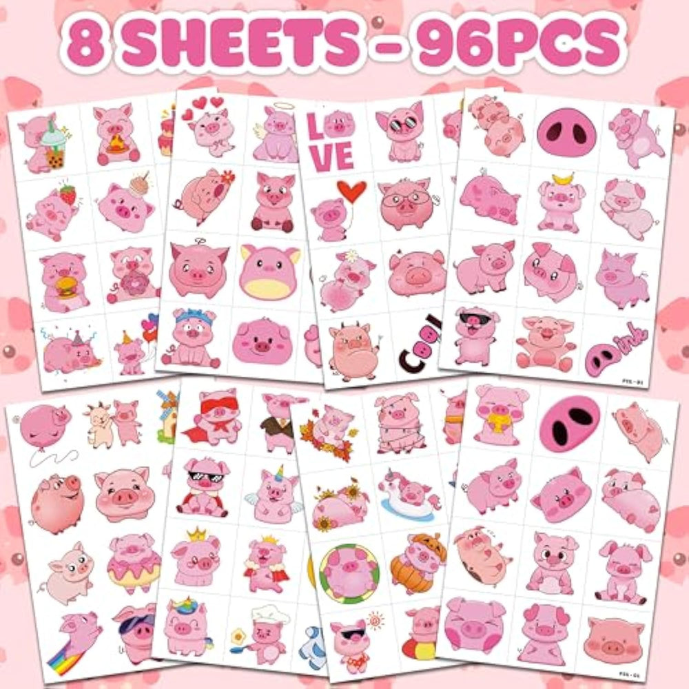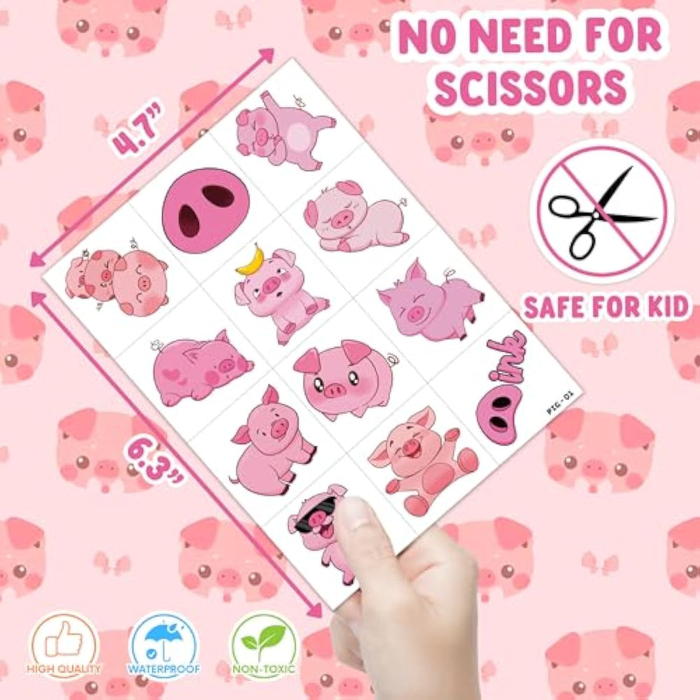 | Package Includes: 8 Sheets Pig Animal Pre-Cut Temporary Tattoo, Total 96 Pcs Different Designs Tattoos Stickers. The Sheets Measures 6.3 Inch X 4.7 Inch, One Size Fit All Adult And Kids. Can Meet Most Of Your Needs. | | Creative And Fun: This Pig Animal Pre-Cut Temporary Tattoos Set Includes A Variety Of Playful And Cute Designs, Encouraging Your Child'S Imagination And Creativity. Bring Nonstop Joy To The Whole Birthday Or Party. Make Your Kids Receive Full Of Expectation And Exploration In Every Festival. | | Perfect For Pig Animal Birthday Party Decorations Supplies Events: Great For Themed Party, Birthday Activities, School Reward And Other Party Events. This Tattoos Stickers Can Be Applied On Arms, Hands, Face, Neck, Shoulders,... To Make You Look Cool At All Kinds Of Party. Popular Hit With Your Kids. You Can Apply Them To Your Body Or Some Smooth Objects, For Example, Glass, Laptop, Paper, Cups, Bottle,.. | | Skin-Friendly: Crafted With Safe Materials, These Tattoos Are Suitable For Sensitive Skin. Parents Can Relax Knowing Their Children Can Express Themselves Freely. Not Recommended For Children Under 3 Years Old, People With A History Of Sensitive Skin, If Symptoms Appear, Stop Using Immediately. | | Simple Application: With Just A Few Easy Steps, Your Child Can Apply These Tattoos Effortlessly. Tear Off The Tattoo Of Choice And Remove Clear Sheet. Place Tattoo Face Down On Skin. Wet The Tattoo Thoroughly. After 15-20 Seconds, Gently Remove The Backing Paper. Allow The Tattoo To Dry. These Delicate Stickers Are Usually Retained All Days And Can Be Cleaned With Baby Oil Or Hand Sanitizer. | |
