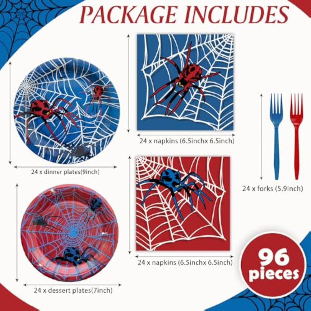 | Package Include: This Spider Birthday Party Plates Set Comes With Everything You Need For 24 Guests, Including 24Pcs 9'' Dinner Plates, 24Pcs 7'' Dessert Plates, 24Pcs Napkins, 24Pcs Plastic Forks, Enough To Meet Your Different Needs In Daily Use And Entertain Guests | | Quality Materials: These Red And Blue Plates Are Made Of Paper, Not Easy To Break And Tear. Disposable Forks Are Made Of Plastic, The Right Size For Easy Use. Every Plate Has Cool Spider And Web Designs To Spice Up Your Birthday Celebration | | Spider Themed Party: These Fun Spider Paper Plates Feature Bold Spider And Web Designs That Really Stand Out. The Vibrant Red, Blue, And Black Colors Add Extra Flair To Your Party, Making It Unforgettable | | Easy To Clean: These Spider Party Supplies Can Be Thrown Directly Into The Trash After The Party. You Can Save A Lot Of Cleaning Time And Enjoy Your Time For A Party With Family And Friends | | Wide Application: Our Spider Web Paper Plates Turn Any Occasion Into A Funny Celebration! Perfect For Birthdays, Baby Showers, Halloween Parties, Bachelor/Bachelorette Nights, Engagement Parties, Picnics, Everyday Dining, And More | |