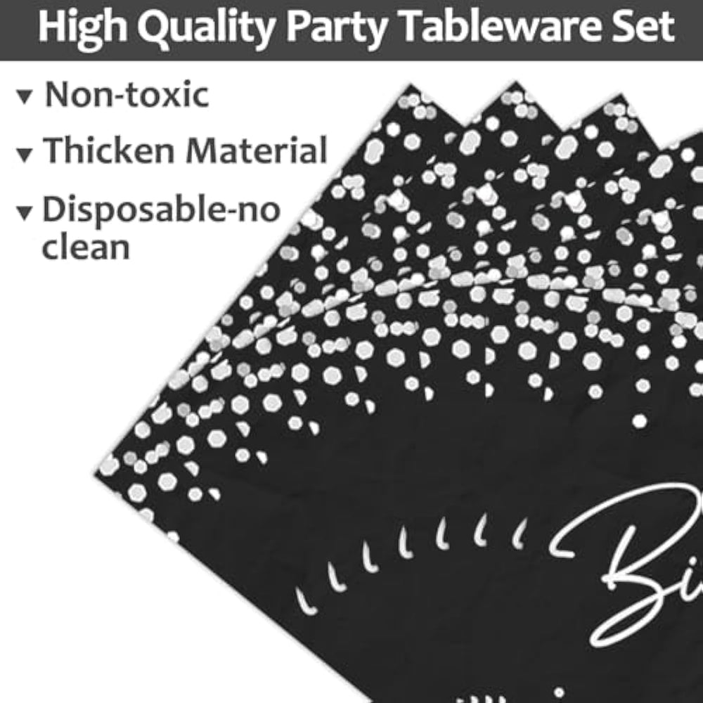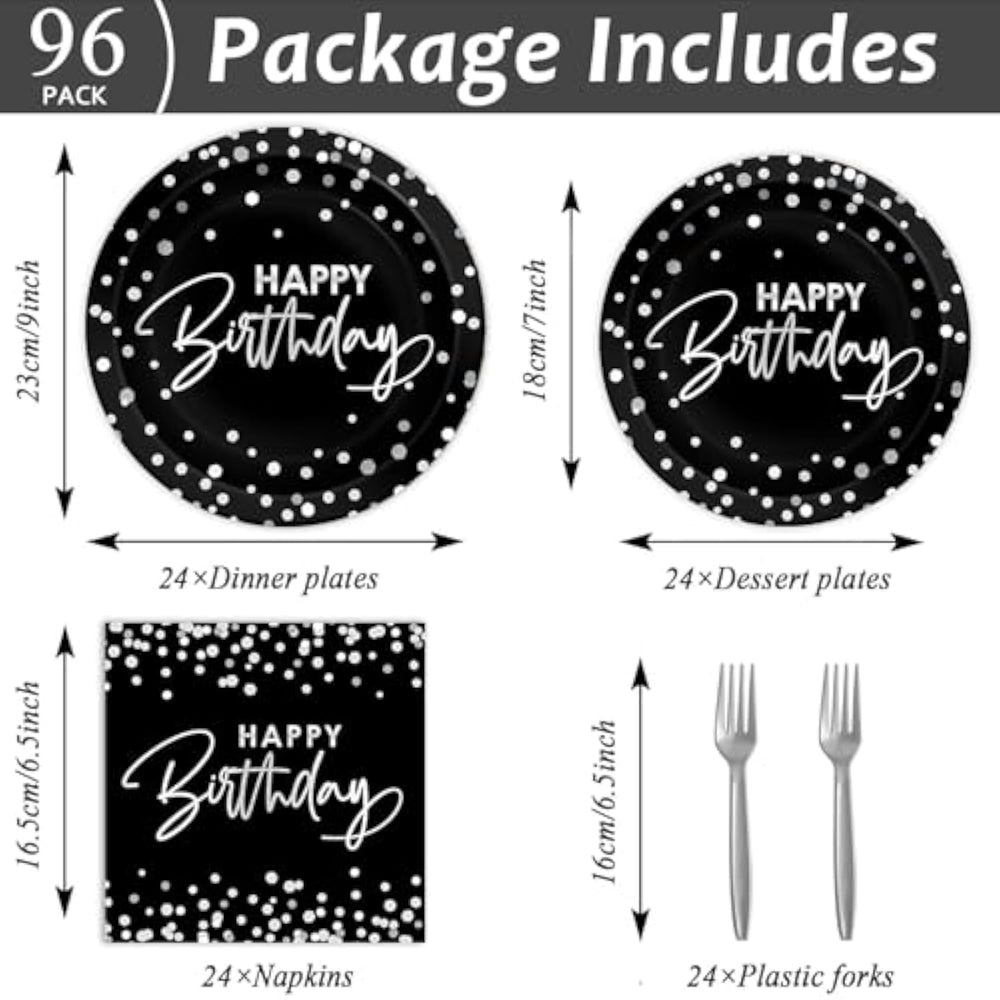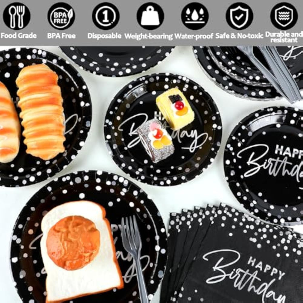 What You Will Get: The Package Comes With 24 Sets Of Black Silver Birthday Party Tableware Sets Supplies, Including 24Pcs 9Inches Birthday Paper Dinner Plates, 24Pcs 7Inches Black White Silver Paper Dessert Plates, And 24Pcs Happy Birthday Paper Napkins(About 6.5 X 6.5 Inches Folded, About 13 X 13 Inches Unfolded), And 24Pcs Of Plastic Forks, Totally 96Pcs, Each Set Serves For 24 Guests. Sufficient Quantities Are Enough For Your Happy Birthday Party. | High-Quality Material: The Black And White Silver Birthday Party Paper Plates Decoration Are Crafted From Premium Paper, Ensuring They Are Odorless, Heat-Resistant, And Durable. The Black Silver Paper Napkins Are Also Of Good Quality, And Not Easily Torn. Additionally, The Included Forks Are Also Odorless. You Can Confidently Use This Set Without Any Concerns. | Time-Saving Convenience: These Disposable Black Silver Paper Plates And Napkin Party Supplies Can Be Conveniently Thrown Away After Use, Saving You The Hassle Of Dishwashing. With The Easy Cleanup, You Can Spend More Quality Time With Your Family And Friends, And Less Time On Post-Party Chores. | Versatile For All Occasions: The Black Silver Birthday Paper Plates And Napkin Packs Are Ideal For Various Occasions. They Beautifully Complement Any Black Silver Birthday-Themed Party Decorations, Including Black Silver Tablecloths, Black Silver Banners, Black Silver Bags, And Black Silver Party Backdrops. This Set Adds A Wonderful Finishing Touch To Your Overall Happy Birthday Party Setup. | Unique Design: Make A Delicate Statement At Your Birthday Party With Our White Silver Polka Dot Black Plates And Napkins. These Party Supplies Bring A Touch Of Elegance To Any Table Setting, Ideal For Those Who Want To Add A Sparkle Of Glamour Without Going Over The Top. The Sleek Black Background With Metallic Silver Polka Dots Is A Classic Combination That'S Both Modern And Timeless, Ensuring Your Party Has A Look Of Refined Taste. |