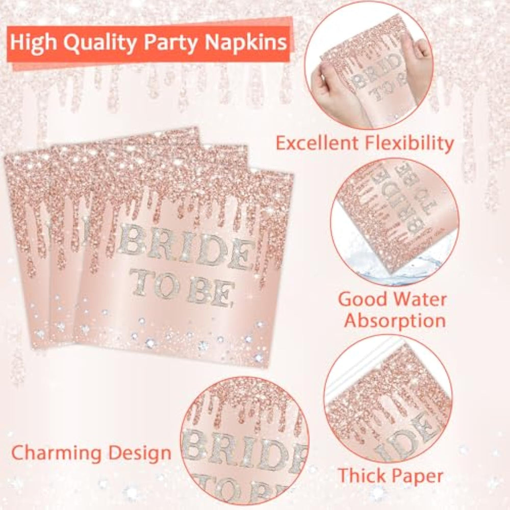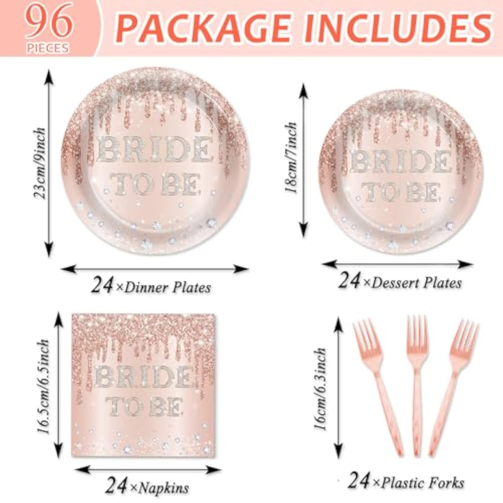 | Package Includes: Each Set Includes 24 Pieces Of 9 Inch/ 23Cm Rose Gold Dinner Plates, 24 Pieces Of 7 Inch/ 18Cm Bride To Be Dessert Plates, 24 Pieces Of 6.5 Inch/ 16.5Cm Rose Gold Napkins, And 24 Pieces Of Pink Forks. This Complete Set Is Ideal For Serving 24 Guests And Will Create A Visually Impressive Table Setting For Your Wedding. | | Eye-Catching Design: Our Bride To Be Party Plates And Napkins Decorations Are Feature A Chic Rose Gold Backdrop Adorned With Sparkling Glitter Drips And Dazzling Diamond Accents, Creating An Elegant And Glamorous Look. The Bold “Bride To Be” Lettering Adds A Celebratory Touch To Your Table Setting, Making This Set The Ideal Choice For Any Bridal Event. | | Save Your Time: These Disposable Pink Rose Gold Party Supplies Can Be Thrown Away After You Use Them, Which Can Save You From The Hassle Of Dish-Washing. When The Party'S Over, You Can Spend More Time With Your Family Or Friends And Less Time Cleaning Up. | | Premium Material: The Bride To Be Plates Napkins Are Made From Premium, Odorless, Heat-Resistant, And Sturdy Paper. The Napkins Are Soft, Strong, And Tear-Resistant, While The Forks Are Crafted From Durable, High-Quality Plastic. You Can Use Them With Complete Confidence. | | Versatile Use: Designed For Elegance And Convenience, These Pink Rose Gold Party Dinnerware Sets Decorations Are Ideal For Wedding, Bridal Shower, Bachelorette Party, Engagement Party, Family Gatherings, Spring Parties, Tea Parties, Picnics And More. The Beautiful Tableware Set Pairs Well With Other Pink Party Supplies Like Tablecloths, Banners, And Hanging Swirls, Adding A Coordinated Touch To Your Wedding Decor. | |
