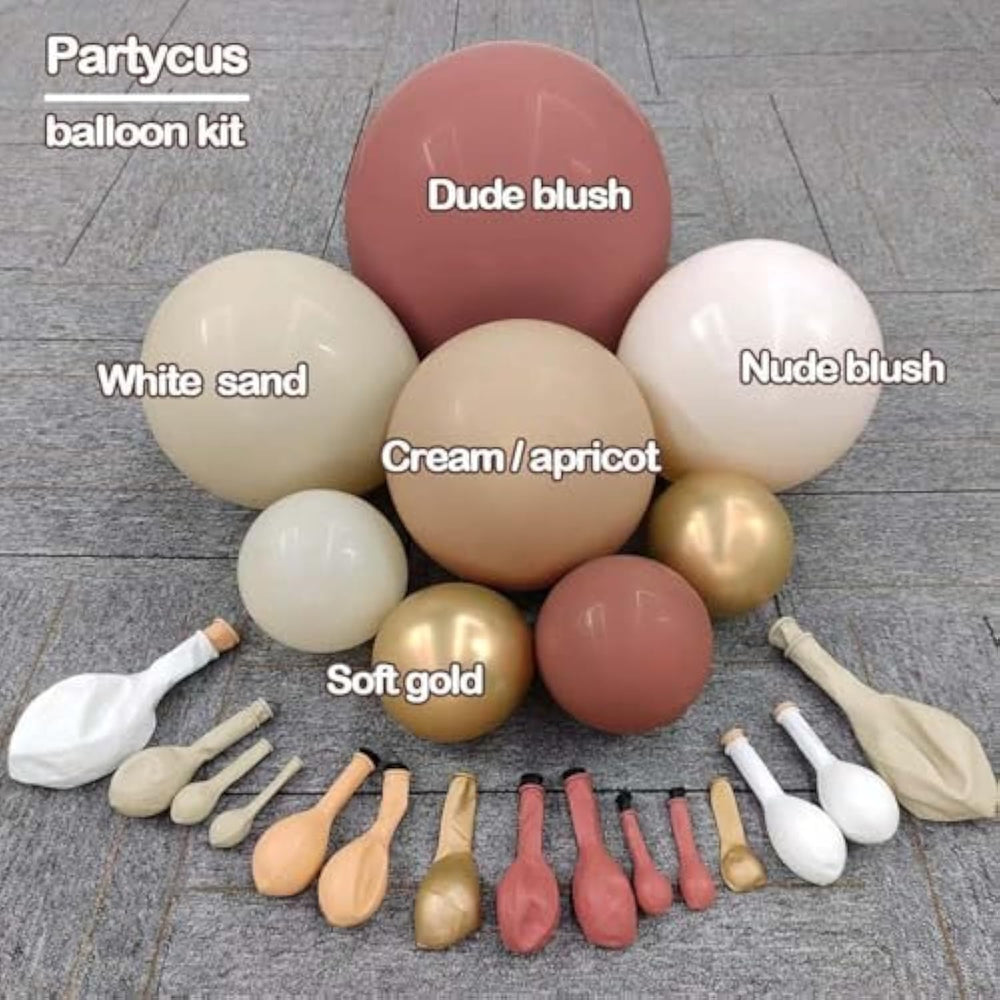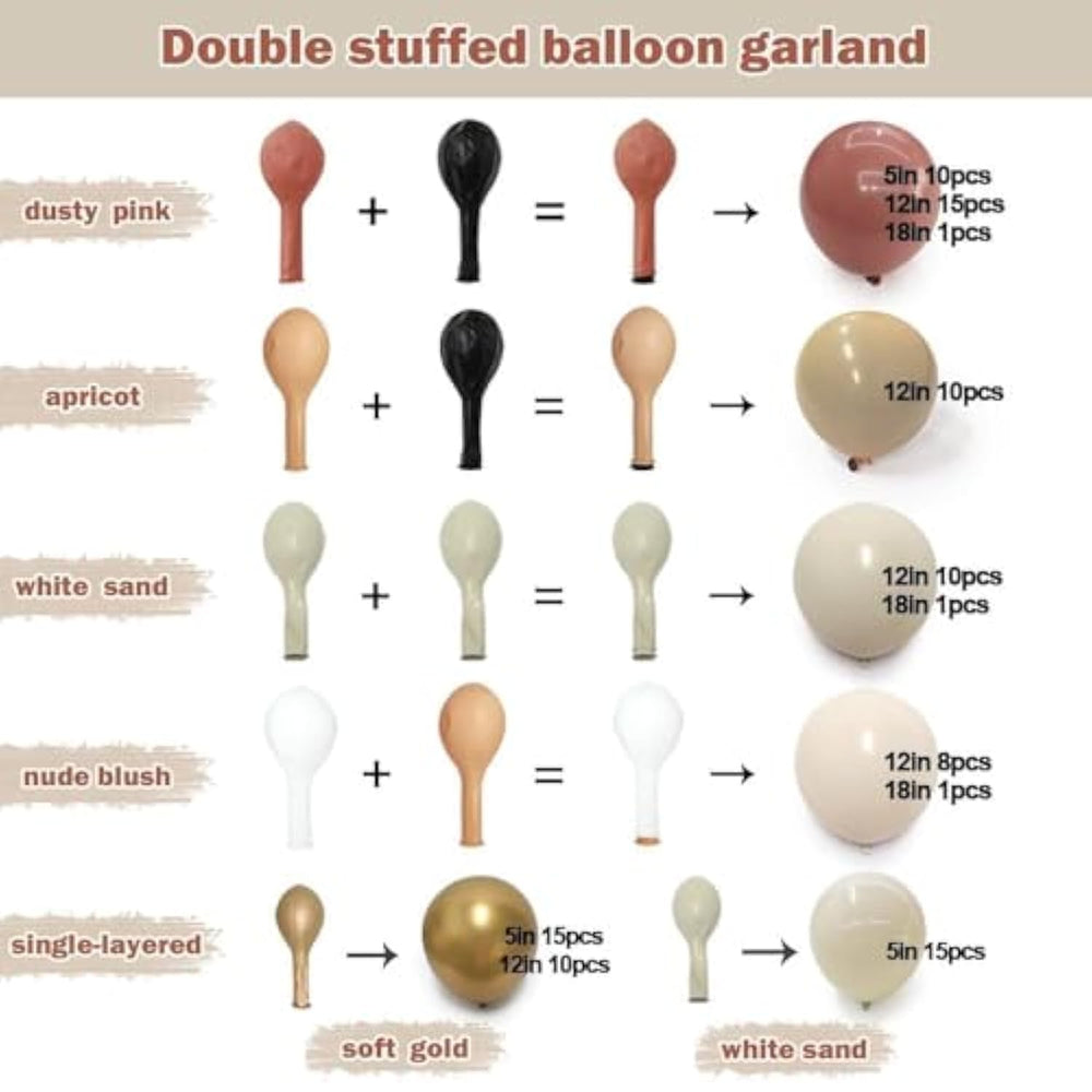 Create an elegant and romantic party display with this dusty rose balloon garland kit featuring a beautiful mix of dusty pink nude blush white sand and cream gold balloons accented with soft gold metallics for a sophisticated boho look the set includes double stuffed mauve apricot tan and nude balloons in 5 inch 12 inch and 18 inch sizes along with balloon strip tape glue dots and ribbon making it easy to build your own stylish balloon arch perfect for baby showers bridal showers birthdays and more made from thick durable natural latex these matte pink and cream balloons can hold air or helium and are recommended to be inflated up to 85 percent for best results for a fuller balloon arch consider using two to three packs flowers and leaves are not included.