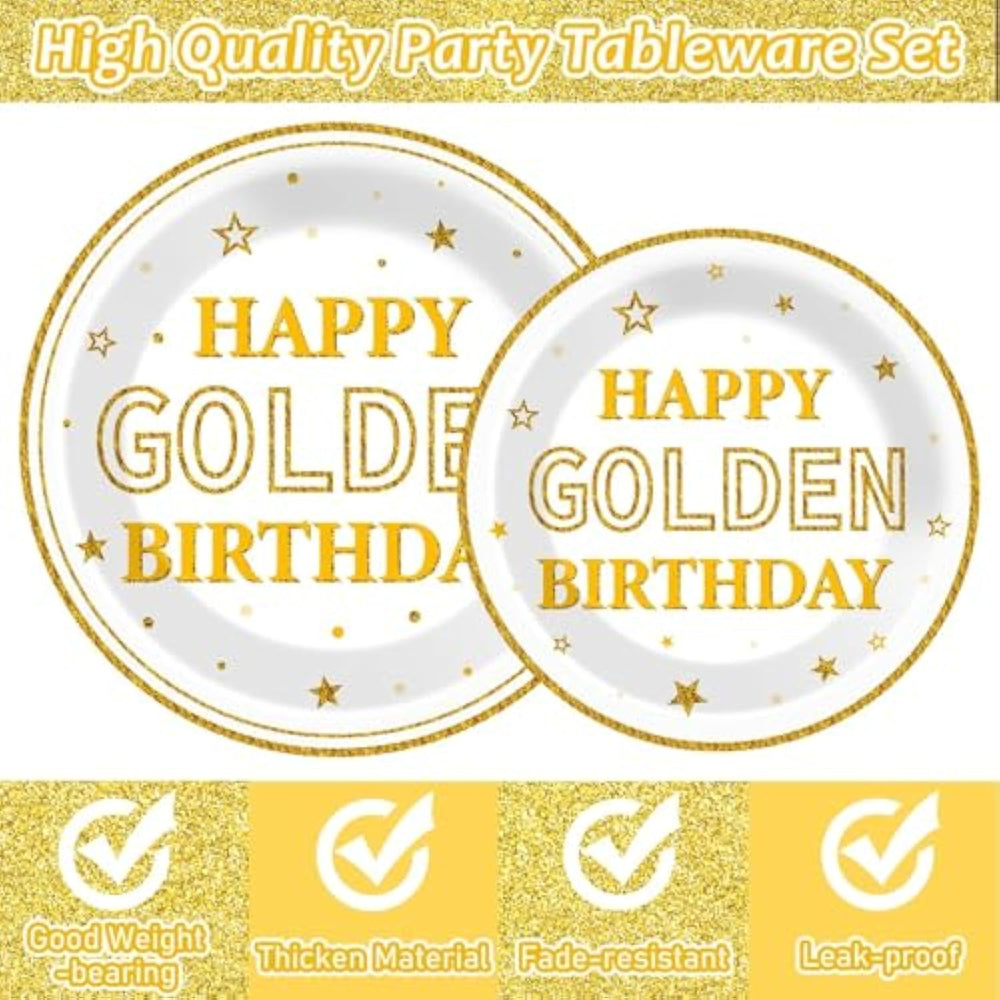 Celebrate in style with this 96-piece Happy Golden Birthday tableware set, designed to serve 24 guests. The set includes 9" dinner plates, 7" glitter dessert plates, 6" napkins, and gold forks—all featuring elegant "Happy Golden Birthday" designs with gold stars and bold lettering. Crafted from quality, thick paper, these pieces are sturdy and well-printed to resist fading. Perfect for indoor or outdoor use, this set saves you cleanup time—just toss everything after the party. Ideal for pairing with other gold-themed decorations like banners and tablecloths for a cohesive, festive look.