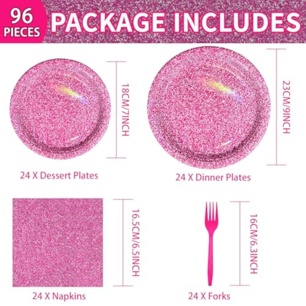 Get ready to dazzle at your party with our 96-piece hot pink party tableware set which includes 24 9-inch pink dinner plates 24 7-inch pink dessert plates 24 pink napkins and 24 pink forks adding a bright glow to your celebration. Featuring a laser holographic print design with a combination of pink and white dots this set emits a radium glow under bright light making your party stand out with its dazzling effect. Made from high-quality 350g thick paper the plates are durable and sturdy while the 3-ply napkins are soft absorbent and durable. The forks are made from high-quality plastic designed to resist breakage and the vibrant patterns and colors are beautifully printed to stay intact. Convenient and disposable this set makes cleanup a breeze letting you enjoy more time at your party without worrying about washing dishes.
