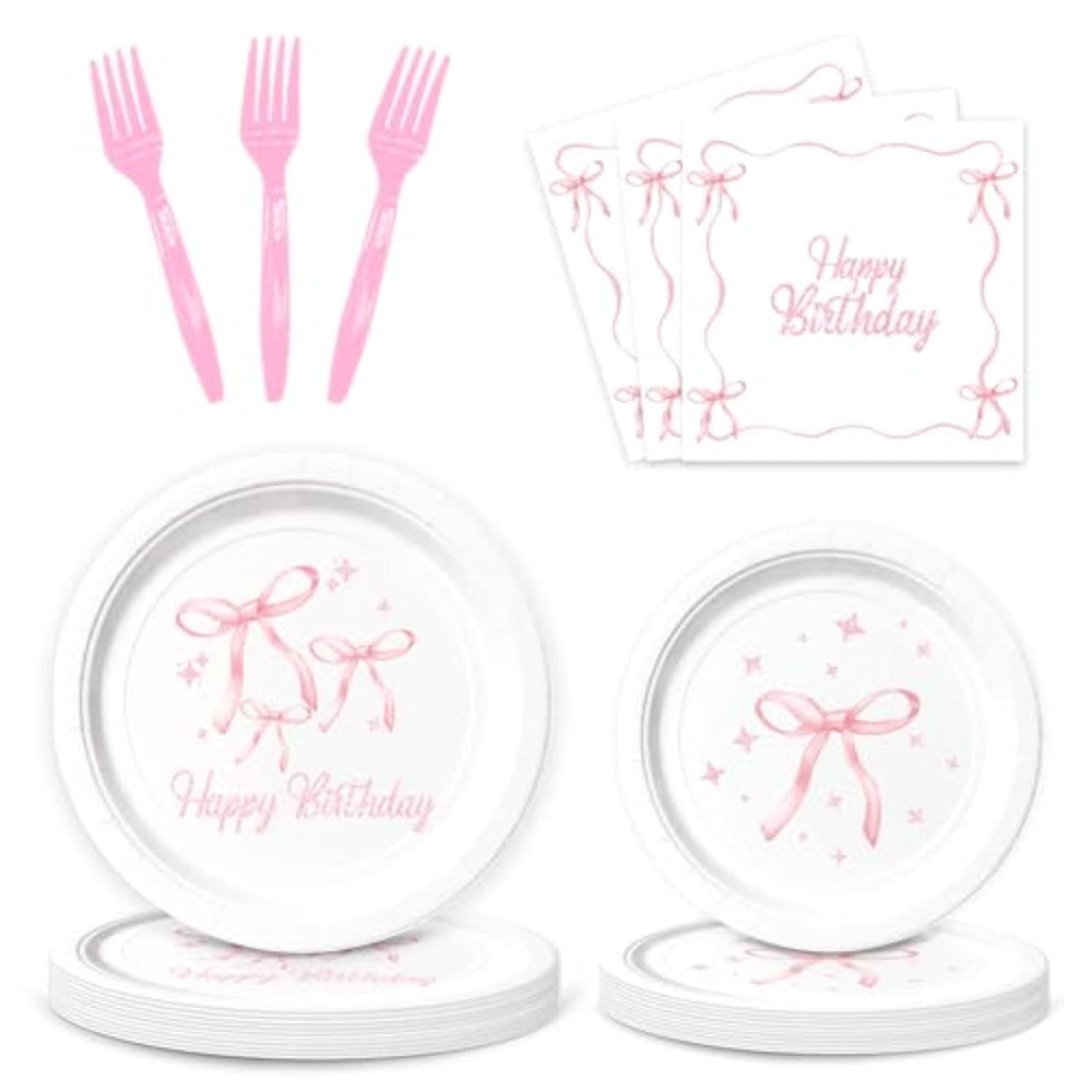 This Pink Bow Party Supplies set is perfect for adding a touch of elegance to your celebration. It includes 24 pieces each of 9" and 7" pink bow plates, 24 napkins (6.5"), and 24 plastic forks, enough to serve 24 guests. Made from high-quality, non-toxic, and odor-free materials, these items are durable, heat-resistant, and feature exquisite pink bow designs that will enhance the atmosphere of your party. Ideal for pink bow-themed events, such as baby showers, birthday parties, or bridal showers, this set ensures your table settings look beautiful and coordinated, delighting all your guests.