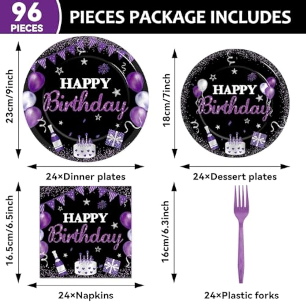| Packing Content: Our Birthday Party Tableware Set Includes 24Pcs 9 Inch Purple Black Dinner Plates, 24Pcs 7 Inch Dessert Plates, 24Pcs Napkins And 24Pcs Purple Forks That Can Serve 24 Guests At A Birthday Party. | | Black Purple And Silver Design: The Black Purple And Silver Design Of These Birthday Theme Party Supplies Combines The Elegant Color With Attractive Patterns Like Balloons, Cakes And More, To Create A Very Appealing Visual Experience. This Versatile Women Birthday Party Favors Are Ideal For Adding A Romantic Atmosphere To Birthdays. | | Convenient To Use: This Black Purple And Silver Birthday Dinnerware Can Rescue Your Hands From Dishwashing Duty. You Can Simply Throw These Girl’ S Birthday Paper Plates Out When Making Cleaning Up After The Birthday Party, So You Can Enjoy More Time With Family In Women Or Girl’S Birthday Party. | | Durable Material: These Purple Black Happy Birthday Plates Napkins Are Made Of High Quality Food Grade Paper Which Is Sturdy, No Smell, Waterproof. These Purple And Black Birthday Party Decors Are Well-Printed And Fade-Resistant To Provide Your Friend A Birthday Celebration Atmosphere. | | Romantic Atmosphere: With Its Charming Black Purple And Silver Colors, Our Purple Silver Birthday Party Decorations Effortlessly Create A Romantic And Enchanting Atmosphere. Elevate Your Special Occasions With This Exquisite Purple Black Tableware Set That Invites A Romantic Ambiance To Enhance Every Moment Shared With Loved Ones. | |