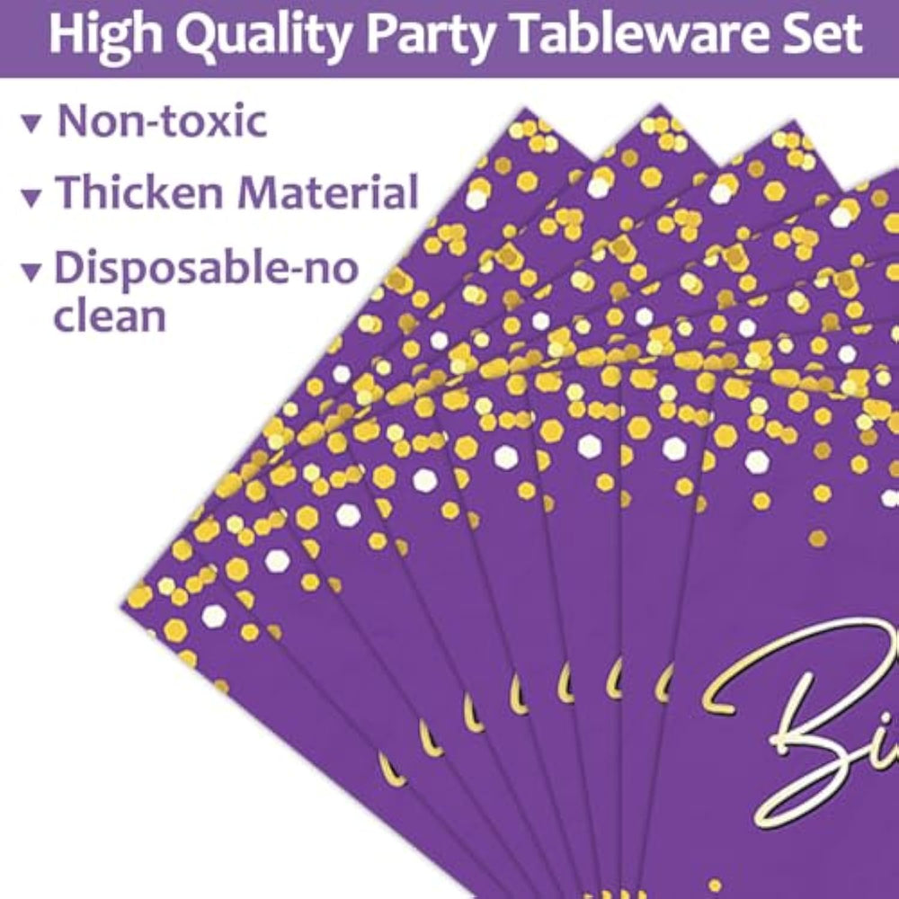 | What You Will Get: The Package Comes With 24 Sets Of Purple Gold Birthday Party Tableware Sets Supplies, Including 24Pcs 9Inches Birthday Paper Dinner Plates, 24Pcs 7Inches Purple Paper Dessert Plates, And 24Pcs Happy Birthday Paper Napkins(About 6.5 X 6.5 Inches Folded, About 13 X 13 Inches Unfolded), And 24Pcs Of Plastic Forks, Totally 96Pcs, Each Set Serves For 24 Guests. Sufficient Quantities Are Enough For Your Happy Birthday Party. | | High-Quality Material: The Purple Birthday Party Paper Plates Decoration Are Crafted From Premium Paper, Ensuring They Are Odorless, Heat-Resistant, And Durable. The Purple Gold Paper Napkins Are Also Of Good Quality, And Not Easily Torn. Additionally, The Included Forks Are Also Odorless. You Can Confidently Use This Set Without Any Concerns. | | Time-Saving Convenience: These Disposable Purple Gold Paper Plates And Napkin Party Supplies Can Be Conveniently Thrown Away After Use, Saving You The Hassle Of Dishwashing. With The Easy Cleanup, You Can Spend More Quality Time With Your Family And Friends, And Less Time On Post-Party Chores. | | Versatile For All Occasions: The Purple Gold Birthday Paper Plates And Napkin Packs Are Ideal For Various Occasions. They Beautifully Complement Any Purple Gold Birthday-Themed Party Decorations, Including Purple Gold Tablecloths, Purple Gold Banners, Purple Gold Bags, And Purple Gold Party Backdrops. This Set Adds A Wonderful Finishing Touch To Your Overall Happy Birthday Party Setup. | | Glamorous Design: The Purple Background And Gold Polka Dot Elements On The Plates And Napkins Create A Glamorous And Delicate Look, Elevating The Overall Aesthetic Of The Happy Birthday Party Table Setting And Creating A Memorable Visual Impact. | |