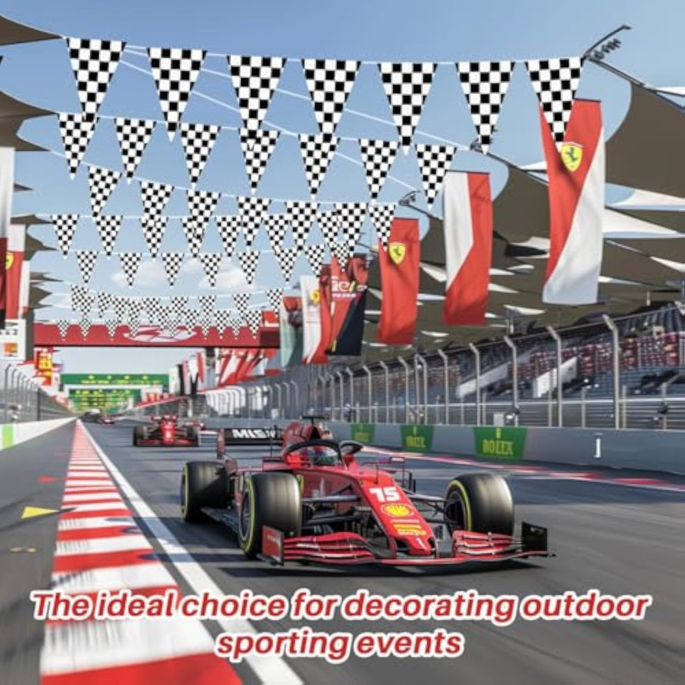 | You Will Receive: 3 Black And White Checkered Flag Banners, Each 10 Meters Long With 20 Triangular Flags, Totalling 98 Feet/ 30 Meters Long, 60 Pennant Flags, Suitable For Decorating Large Venues, Indoors Or Outdoors, With Full Coverage Of Each Corner | | Checkered Pennant Banner Racing Flag: Our Checkered Banners Are Made From Durable Pe Material, Not Easy To Tear Or Fade. The Classic Black And White Design Makes These Race Car Flag Banners Ideal For Any Indoor Or Outdoor Setting, Adding A Festive Racing Atmosphere | | Perfect Size For Any Event: Each Pennant Banner Flag Measures 8×12 Inches (20×30 Cm), Providing A Striking And Unique Display. Our Black And White Checkered Pennant Is Perfect For Waving At Races, Showcasing At Events, Or Decorating Venues | | Versatile Usage: Perfect For Race Car Birthday Party Decorations, Sports Events, Outdoor Picnics, And More. These Black And White Racing Flags Can Be Easily Hung On Walls, Trees, Fences, Or Porches, Adding A Festive Atmosphere To Any Gathering | | Easy To Use And Reusable: The Banner Comes Pre-Attached To A String For Convenience, Featuring Reinforced Stitching To Prevent Flags From Falling Off, Ensuring It Is Durable And Reusable | |