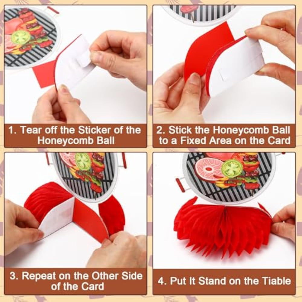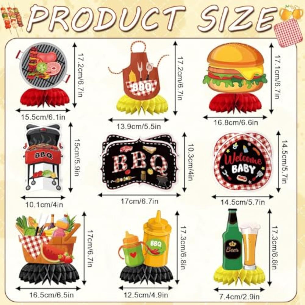 | You Will Receive 9 Pieces Bbq Party Decorations, Each With A Different Style, Which Is Enough To Meet Your Party Decoration Needs, Create A Rich Summer Atmosphere, And Make Your Summer Picnic Party More Interesting And Unforgettable | | Good-Quality Materials: These Picnic Decorations Are Made Of Heavy-Duty Double-Sided Cardboard And Honeycomb Balls, With Smooth And Shiny Surface, Tear-Proof, Beautifully Printed, Not Easy To Fade Or Deform, And Can Be Used For A Long Time | | Bbq Theme Design:Our Picnic Theme Honeycomb Centerpieces Take Bbq Elements As The Theme, And Designed With Hamburger, Checkered, Bottle, Apron, Grill And Other Elements, Which Is Make Your Bbq Theme Party Full Of Vitality And Joy | | Easy To Use:These Bbq Decorations Are About 7 × 6 Inches In Size, Which Is Very Simple And Quick To Install. You Only Need To Tear Off The Sticker Of The Honeycomb Ball, Paste In The Designated Position Of The Card, Repeat The Operation On The Other Side Of The Card, And Finally Put The Bbq Baby Shower Decorations At The Party Site, Which Can Easily Complete The Decoration And Add A Touch Of Vivid Color To Your Summer Picnic Party | | Wide Application: The Bbq Party Supplies Are Suitable For Various Occasions Such As Bbq Theme Party, Picnic Themed Party, Birthday Party, Summer Party, Baby Showers, Etc., Can Decorate The Party Table And Make Your Party More Attractive.You Can Also Hang Bbq Picnic Tables Centerpieces With Clips As Video Background And Photo Background, And Record Happy Times With Friends And Family | |