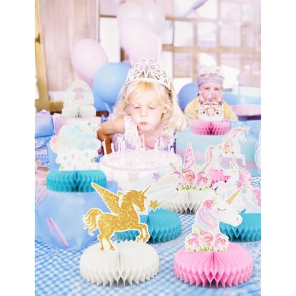 This unicorn birthday decoration set includes 9 rainbow unicorn honeycomb centerpieces featuring unicorns, rainbows, stars, clouds, and castles with sturdy honeycomb bases, adding a fun and magical touch to any party. Made from durable, double-sided printed cardstock and vibrant tissue paper, these high-quality decorations ensure long-lasting use. Easy to assemble in just a few steps, simply peel, stick, and unfold the honeycomb base to create adorable table decorations, making party setup quick and effortless.