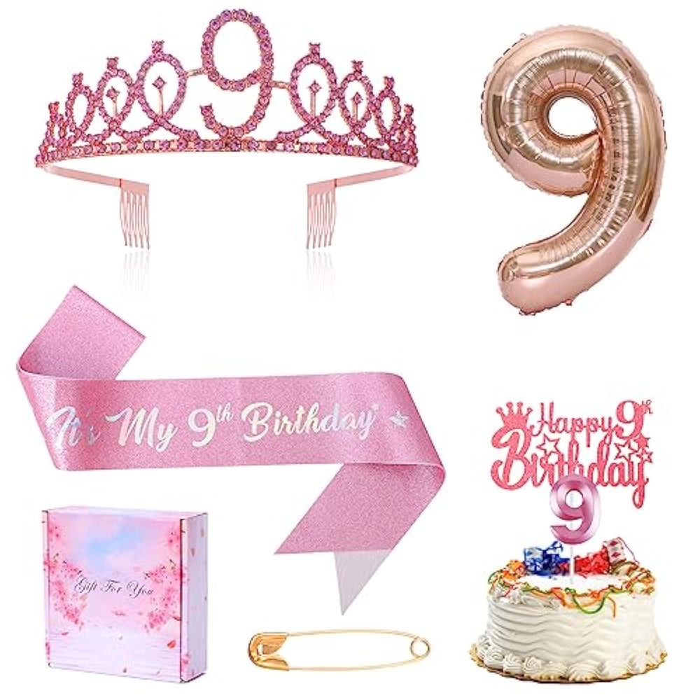 | ?Package Include?Pink 9Th Birthday Candle, Pink "It'S My 9Th Birthday" Sash, 9 Birthday Crown/Tiara, 9 Birthday Cake Topper, 32Inch Number 9 Digital Come With A Pink Gift Box; | | ?Birthday Sash Tiara?The Sash Made From Soft Glitter Fabric Using Hot Pressed Stamping Foil,The Sliver Word Make It Shinning All The Time;Tiara Are Adjustable As Well Comes With Comb Design That Can Holds And Stable On Top Of The Hair;It'S Diffcult To Find A Great Birthday Decor After Age 2,But Our Gift Sets Can Give You All You Need On A Special Birthday; | | ?Birthday Candle And Cake Topper?Our Candle Is Different For Most,We Are In Pink,Which More Suitable For Little Girl And The Cake Topper Is "Happy 8Th Birthday" All Full Of Age 9'S Elements; 32Inch Large Foil Number Balloon Great Photodrop For You; | | ?Birthday Gifts For Girl?Our Item Packaged In A Pink Box "Gift For You"On Side,So It'S Really A Great Choose To Gift For Your Granddaughters,Little Girl'S Birthday;She Will Be Delighted With It It Will Make Her Feel A Special Birthday Girl;And Will Feel Very Grown Up With Her Own Sash And Tiara. Just Choose It!!! | | ?Birthday Celebration?How Beautiful Is This Little Pack Of Goodies When You Want To Make Your Princess Feel Special. This Is The Ideal Gift. To Ensure That She Feels Just That.Crowns Sashs Candles Foil Balloons Cake Toppers.Everything You Would Need For A Little Girl'S 8Th Birthday!It'S Fantastic For That Special Birthday. Very Good Quality Materials.Super All Round Value For The Money. | |