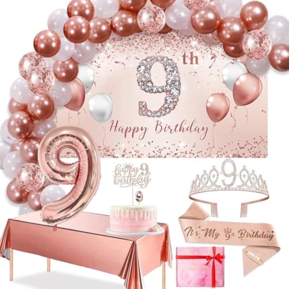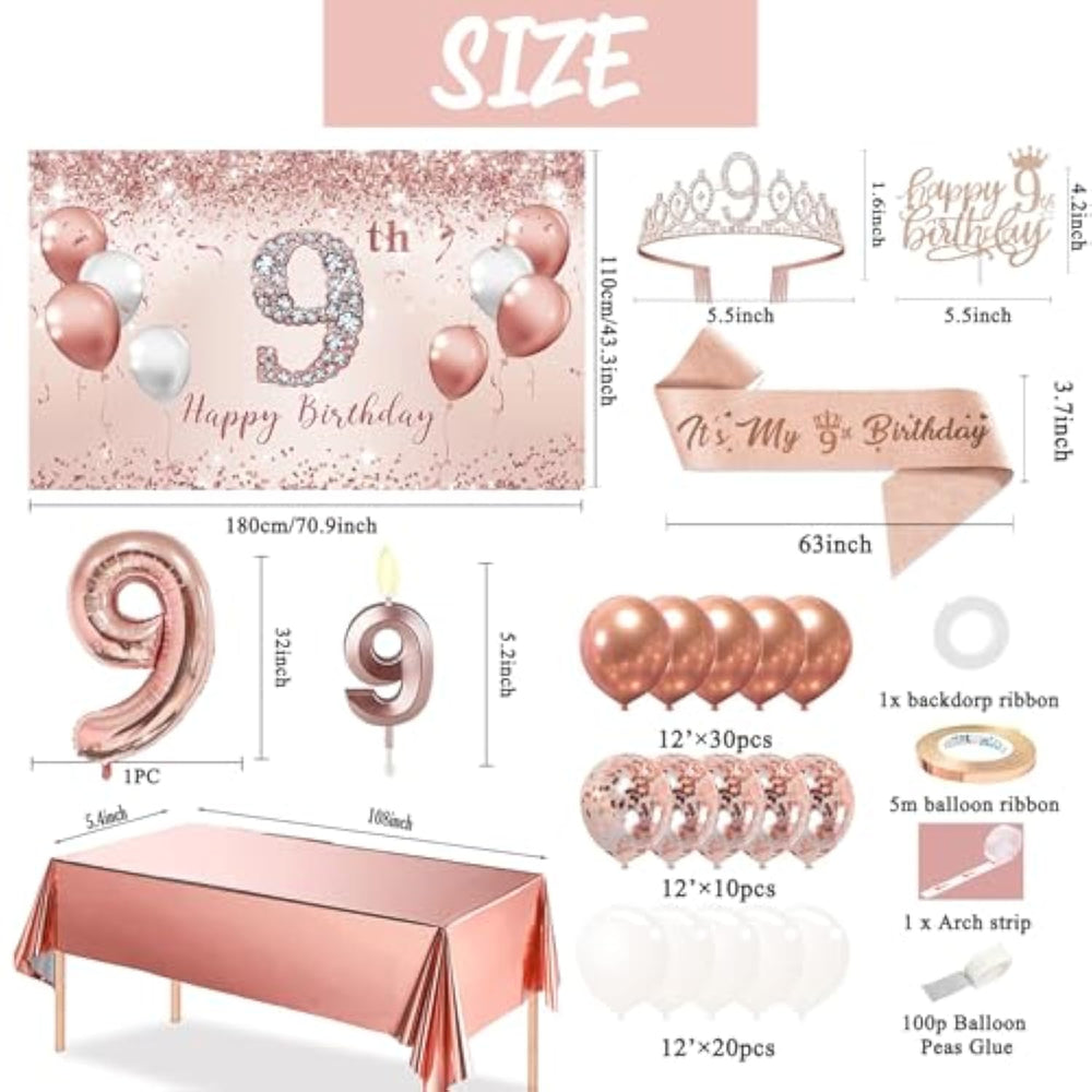 | [9Th Birthday] Package Included?1Pc 9Th Party Banner, 1Pc Pink 9 Birthday Crown, 1Pc Sash And A Pearl Pin, 1Pc Happy 9Th Birthday Cake Topper, Number 9 Balloons 32Inches, 1Pc Rose Gold Tablecloth.And 60 Latex Balloons The 9Th Birthday Decoration Set Will Heighten The Excitement Of The Girlss 9Th Birthday Party. | | [9 Years Old Banner] The Rose Gold 7Th Birthday Backdrop Is 5.9Ft(Width)X3.6Ft(Height), It Printed By High-Quality Digital Resolution And It Is Large For Pink Rose Gold Party Theme Color. There Are Copper Holes On The Four Corners Of The 9Th Banner, You Can Hang It On The Tree, Wall And Anywhere You Want. | | [9Th Sash For Girls] The Rose Gold 9Th Birthday Sash Is Made From High Quality Glitter Fabric And Printed With Rose Gold Foil Words. Elegant And Gorgeous! The Sash Is In 63Inch Length And Comes With A Pretty Pearl Pin. You Can Adjust The Length By Using The Pearl Pin In The Package. The Pin Also Put The Perfect Finishing Touch On Your Party Outfit. | | [Sturdy Metal Crown] The Pink Tiara Is Made From High Quality Alloy And Rhinestone. Suitable For Most Girls And Girls. Crown With Combs: Two Combs Located On Both Ends Of The Crown Can Grip The Hair More Tightly. | | [Great Birthday Gift For Her] 9Th Arch Balloon Birthday Party Set Is Suitable For Lady'S 9Th Birthday Party Decoration. Get Our Birthday Banner, Sash And Crown Set To Add Much Fun To Your Birthday Celebration. It Will Be A Memorable One For 9 Years Old Birthday Girls And Makes 9Th Birthday Party More Meaningful. | |